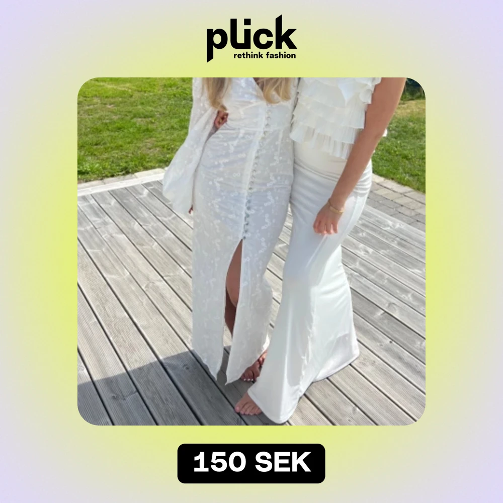 Vit långkjol med ”fishtail”, använd 1 gång. Väldigt lång i modellen, men går att justeras och vika ner i midjan för önskad längd 🤍