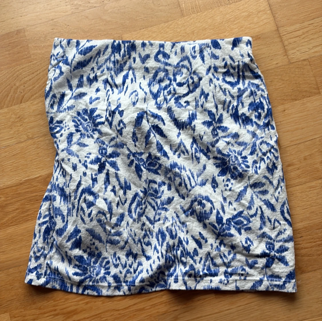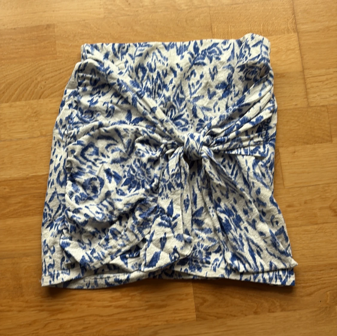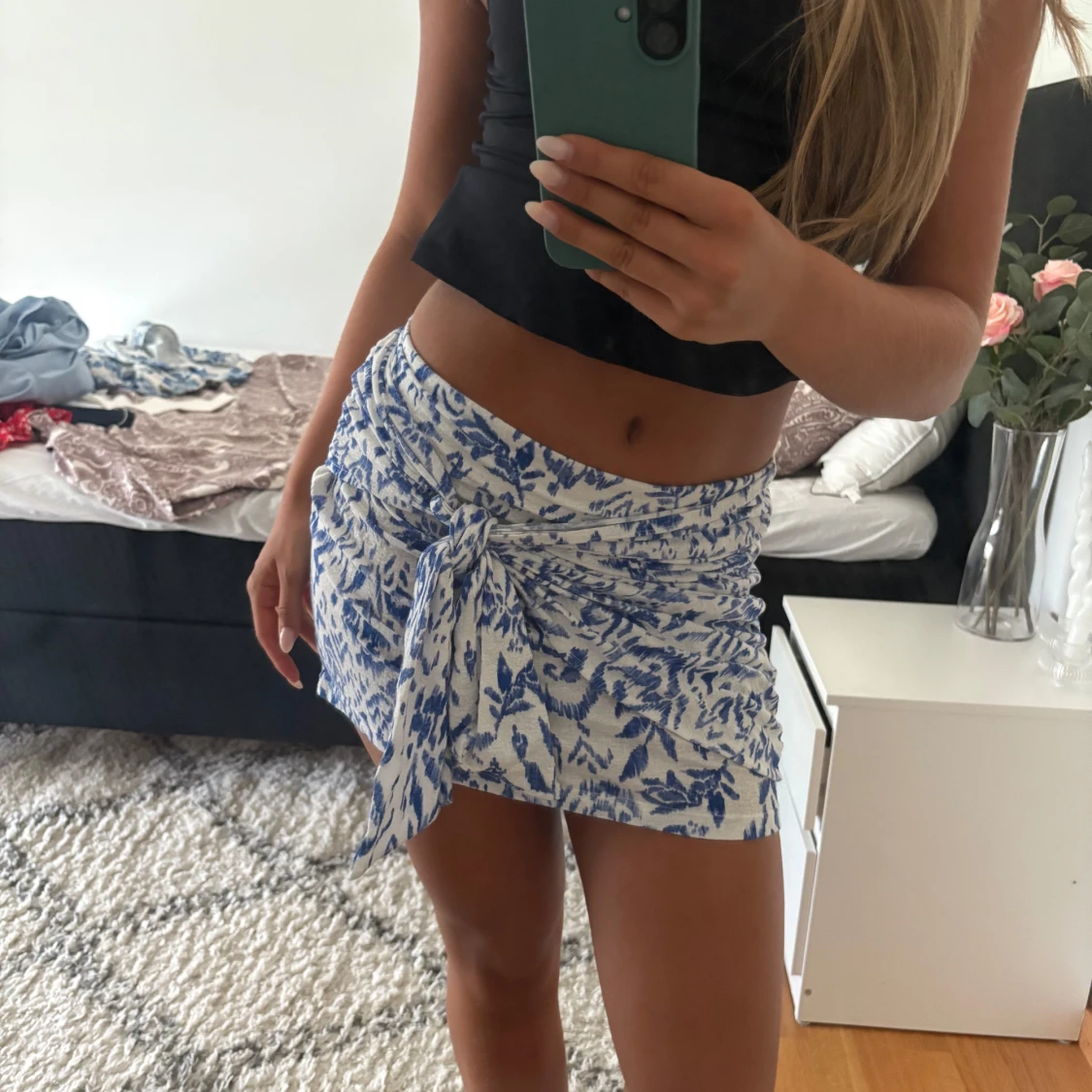 Supersöt kort omlottkjol från Gina Tricot (strl S) i vitt med blått mönster. Kjolen har knyt i sidan/framtill som binds upp genom en helt vanlig knut. Materialet är mjukt, lätt och väldigt stretchigt! Inte använd särskilt ofta och fortfarande i fint skick! 🤍🩵