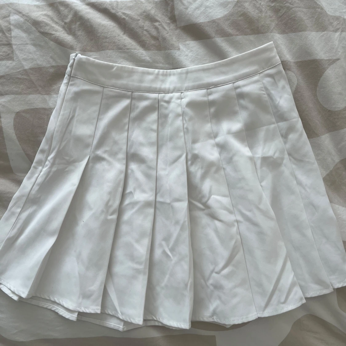Säljer en vit plisserad kortkjol med klassisk tennisstil. Kjolen har bred linning och tydliga veck som ger en snygg och sportig look. Perfekt att matcha med en enkel topp eller hoodie.