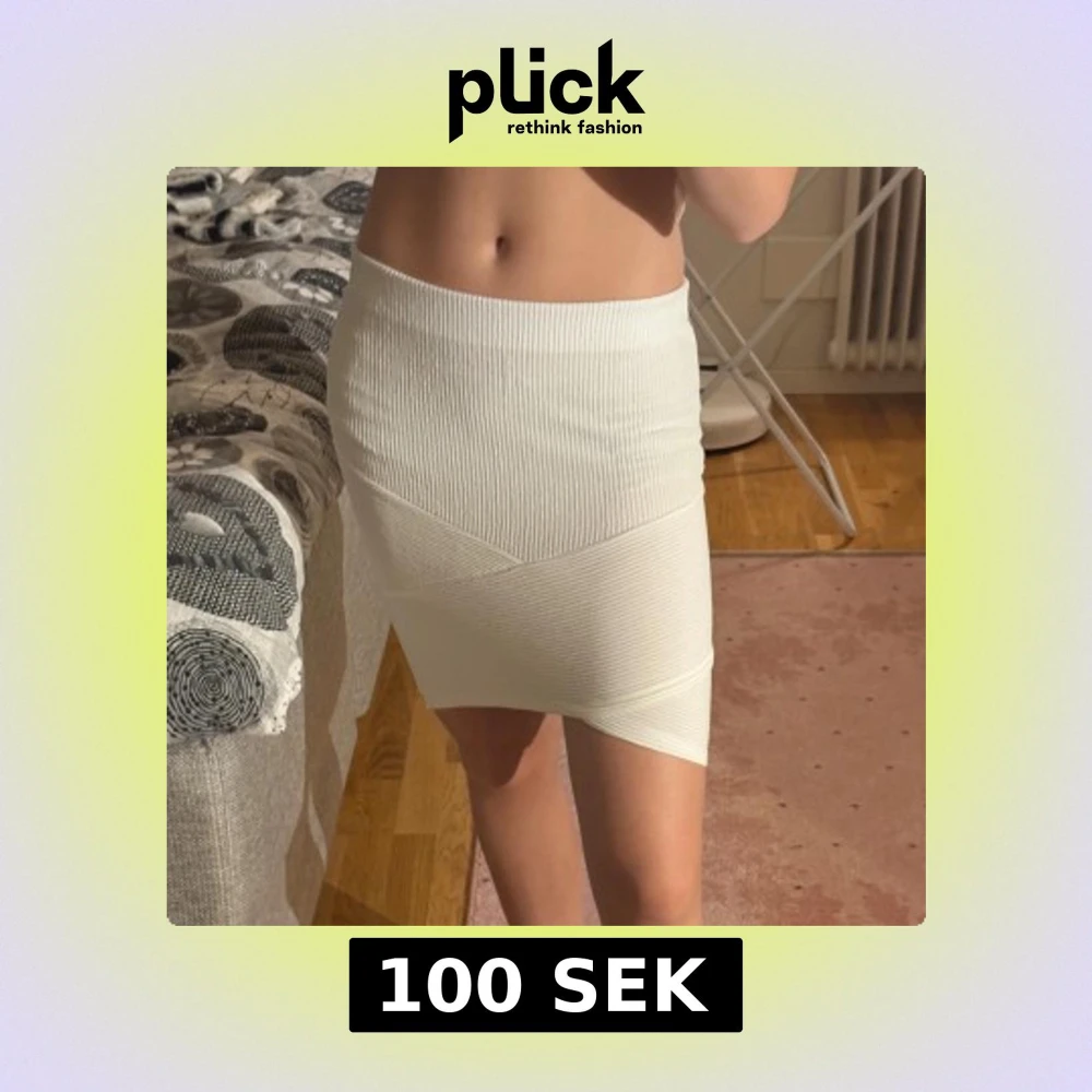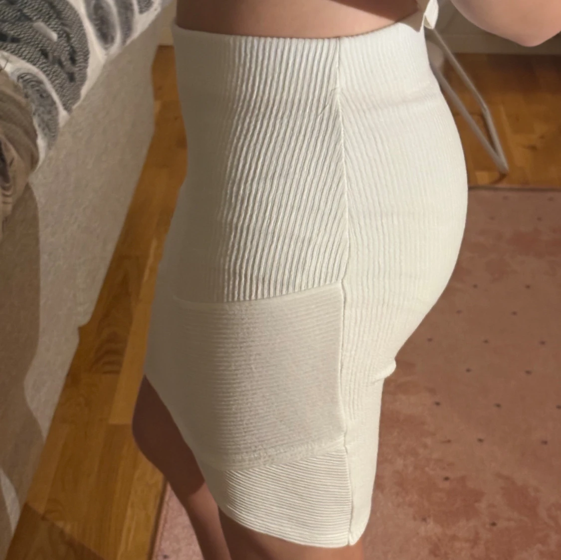 Säljer en vit ribbad kortkjol med tight passform och hög midja. Kjolen är stretchig och har en snygg struktur med olika riktningar på ribborna som ger en cool look. Perfekt att styla med crop top eller oversized hoodie. Dessutom i jättefint skick!