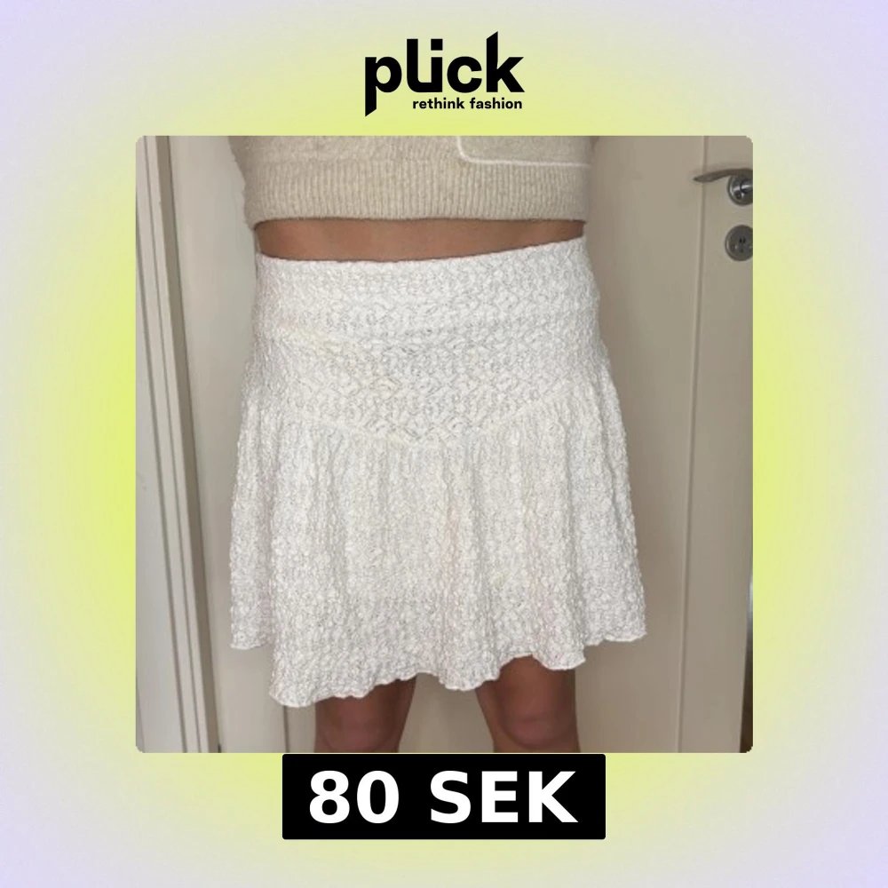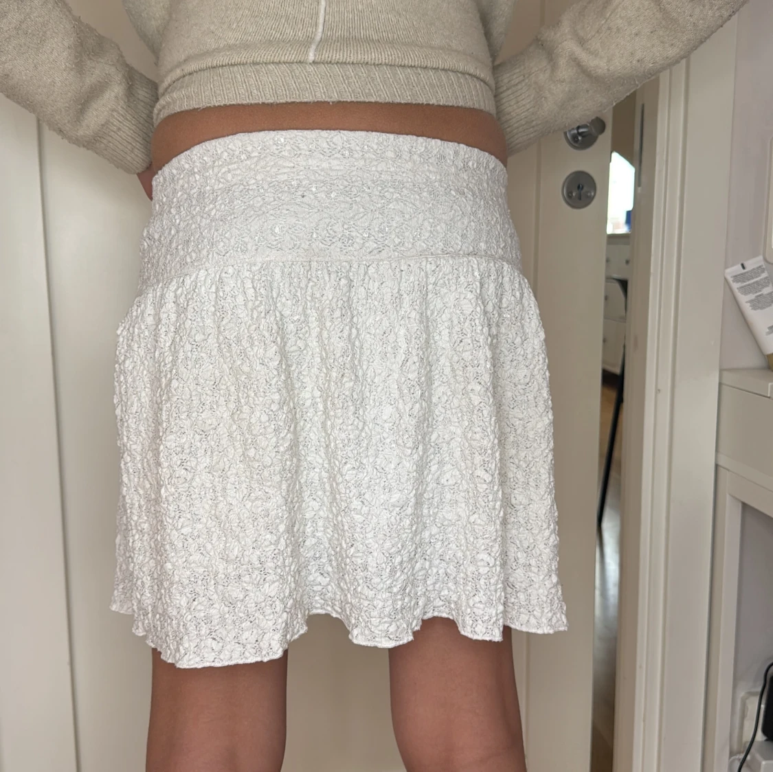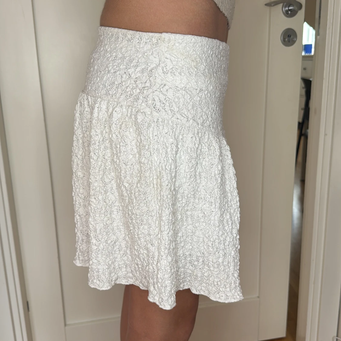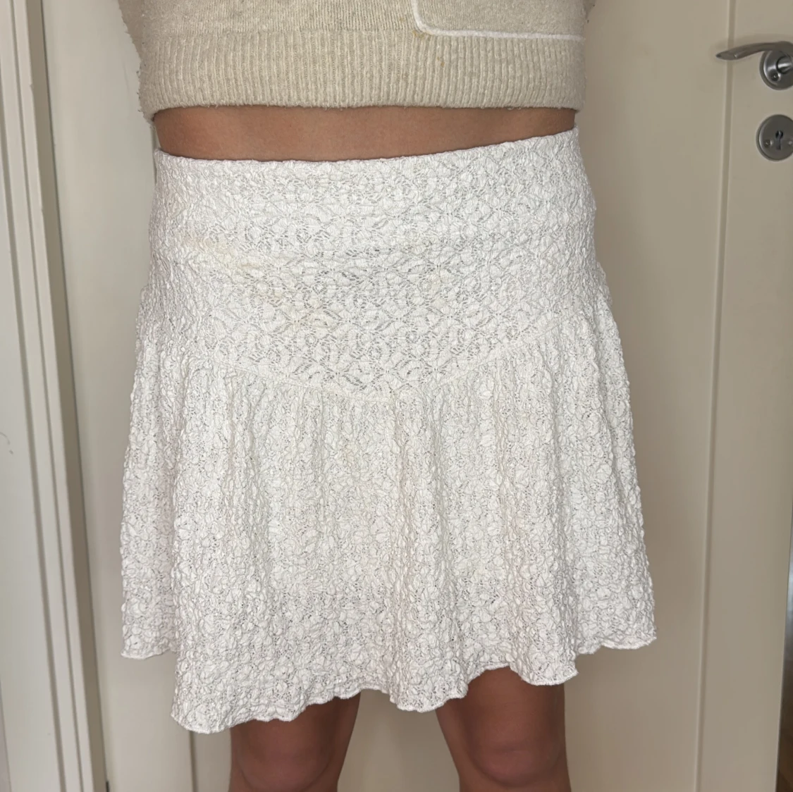 Säljer en söt vit kjol med bred midja och volangkant. Kjolen har ett fint spetsmönster och är lätt utsvängd för en feminin look. Perfekt att matcha med en enkel topp.