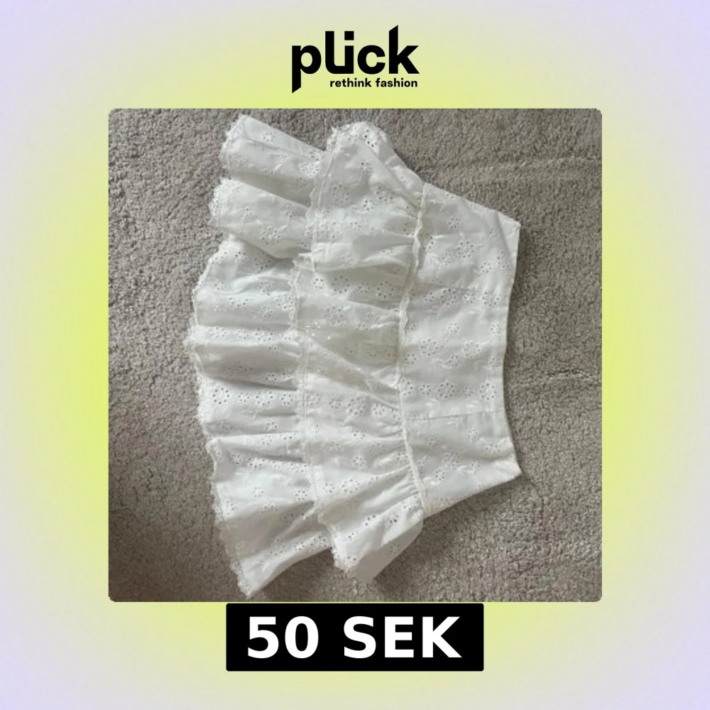 Charmig vit kortkjol med volanger och broderade blommor. Perfekt för en somrig look med sin lätta och luftiga design.