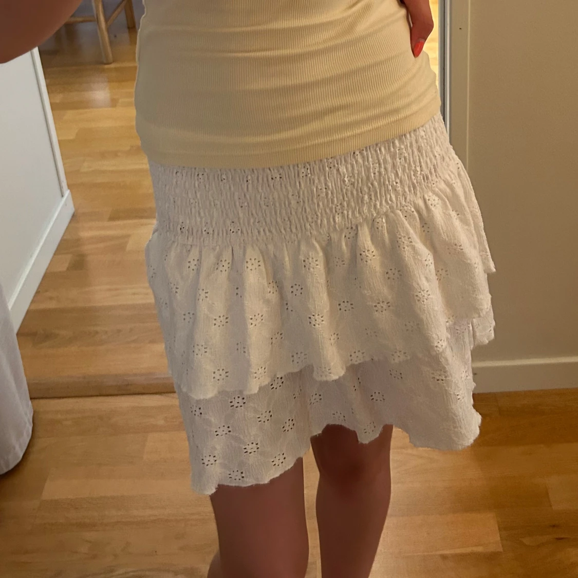 Supersöt vit kortkjol med volanger och broderade detaljer. Kjolen har smock i midjan för en bekväm passform och är gjord i luftigt material, perfekt för varma dagar. Den har ett romantiskt och somrigt uttryck som är lätt att matcha. Storlek 134/140 men passar även mig som är 164cm pga den stretchiga midjan 🥰skriv vid funderingar