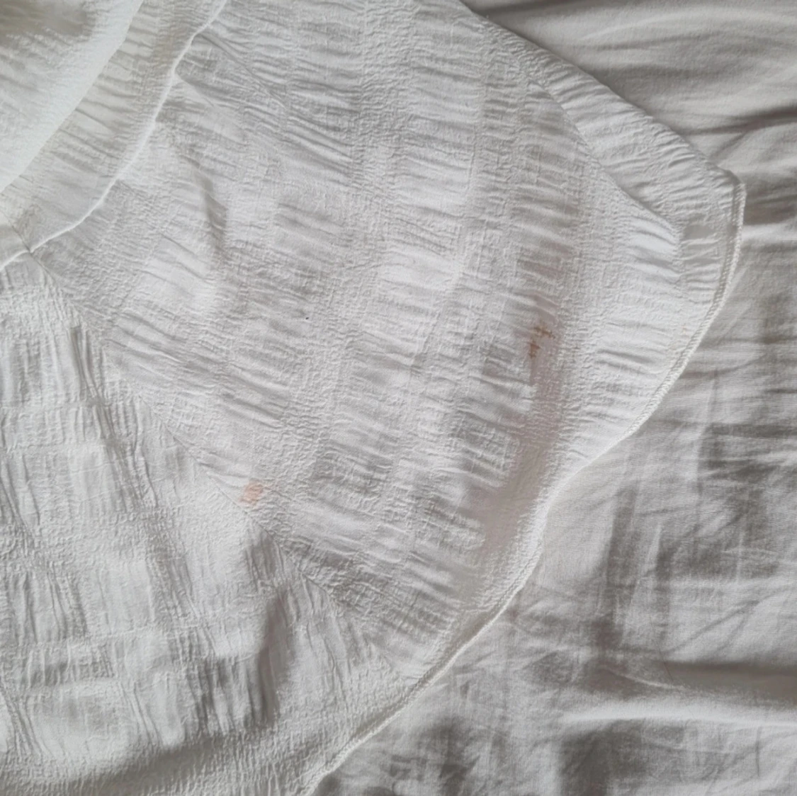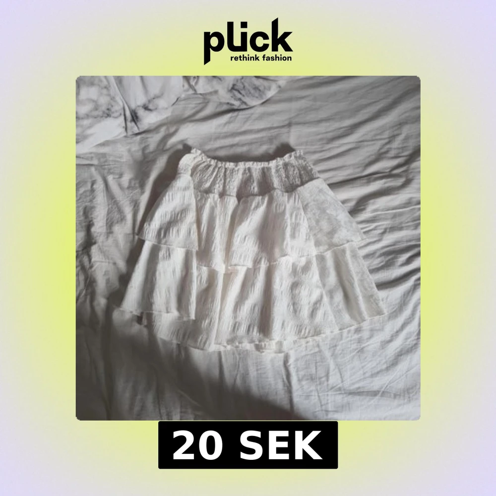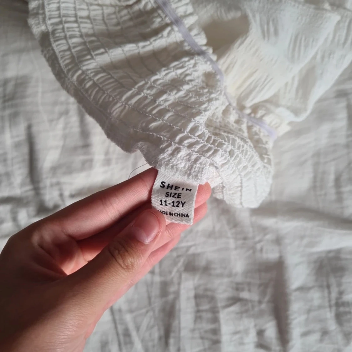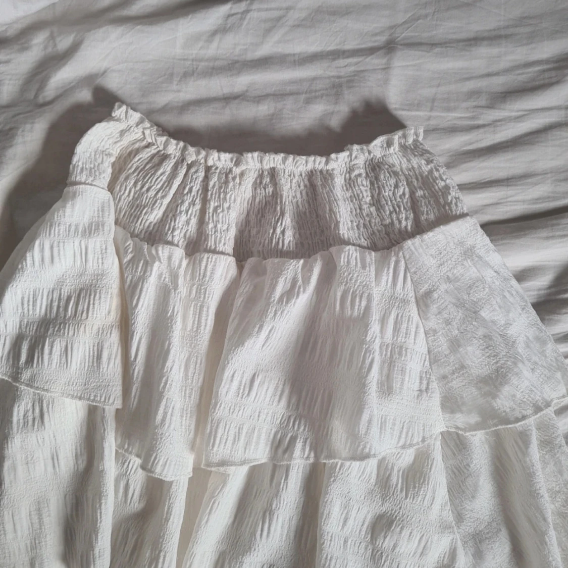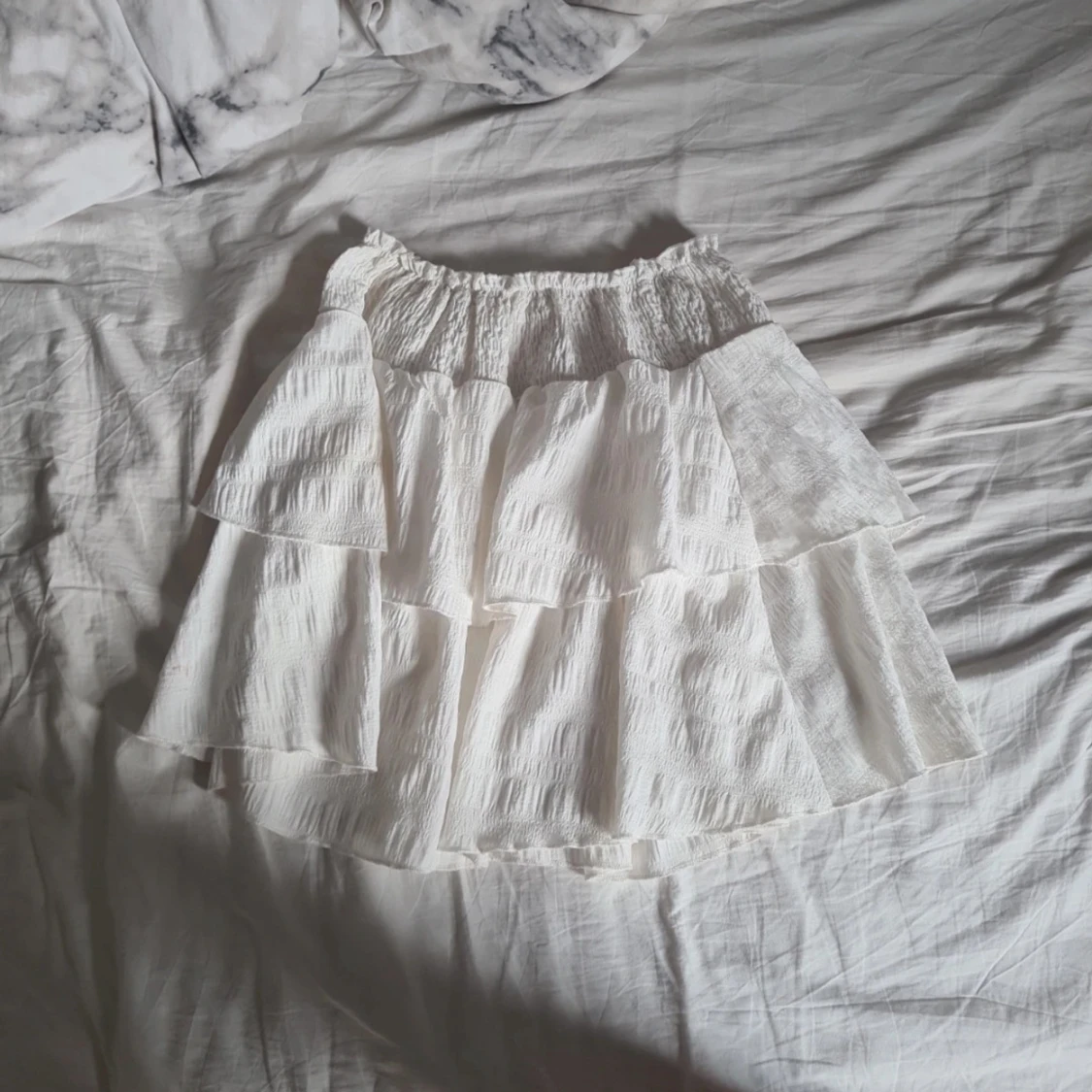 Superfin vit kortkjol från SHEIN med flera lager volanger och smock i midjan. Kjolen är gjord i ett lätt, strukturerat tyg som känns luftigt och passar perfekt till varma dagar. Enkel att matcha med crop tops eller oversized t-shirts. Storlek 10-11y men skulle säga att det är xs, då kjolen är lite stor i storleken. Finns två små fläckar (se bild 4)