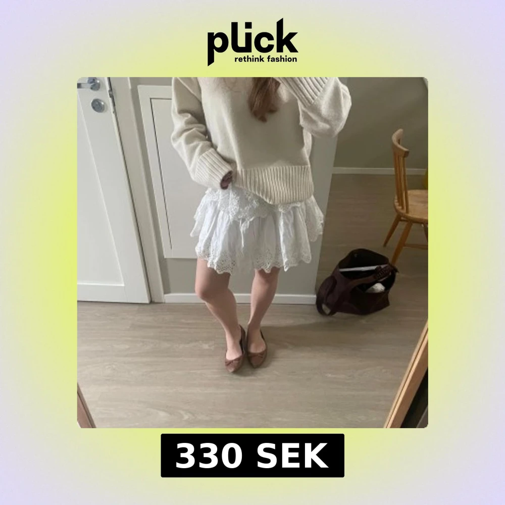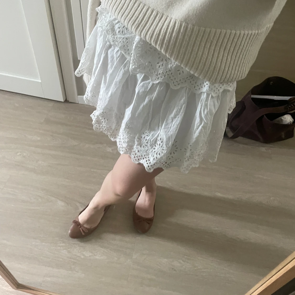 Supersöt vit kortkjol med flera lager volanger och broderade spetsdetaljer. Kjolen har en luftig känsla och vackra blommiga broderier längs kanterna. Perfekt för dig som gillar romantisk och feminin stil.
