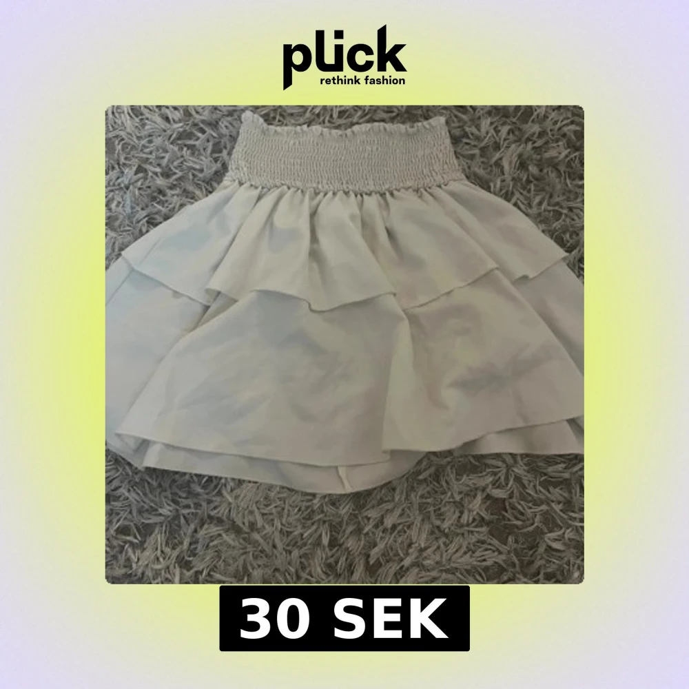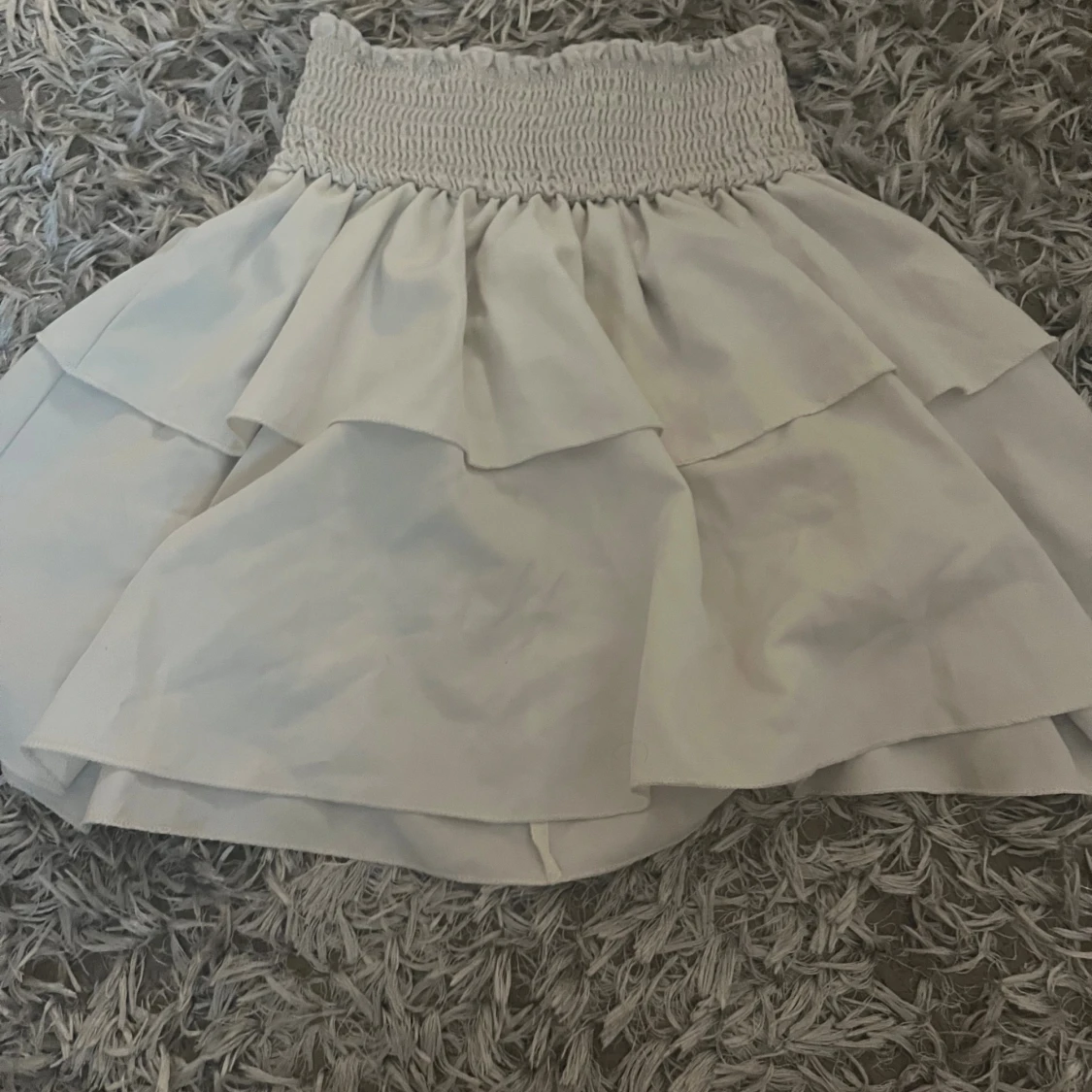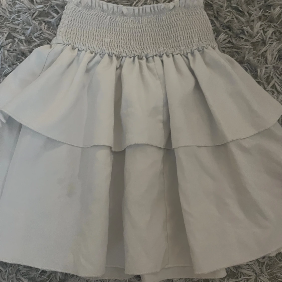 Supersöt vit kortkjol med bred smock i midjan och dubbla volanger. Kjolen har en luftig känsla och passar perfekt till varmare dagar. Den elastiska midjan gör den bekväm och enkel att styla med olika toppar.