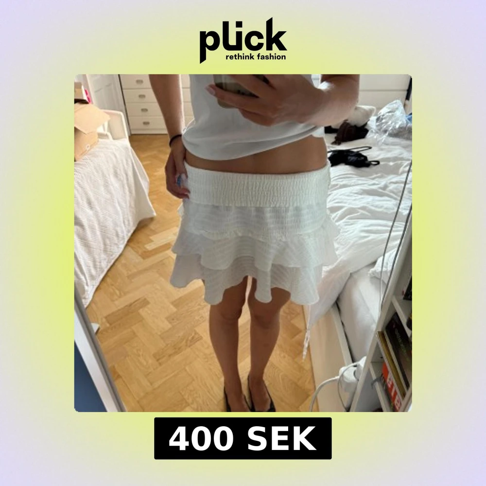 Supersöt vit kortkjol med bred smock i midjan och dubbla volanger. Kjolen är lätt och luftig, perfekt för varma dagar. Materialet känns som bomull eller polyester och ger en fräsch och somrig vibe. Passar perfekt till ett linne eller crop top.