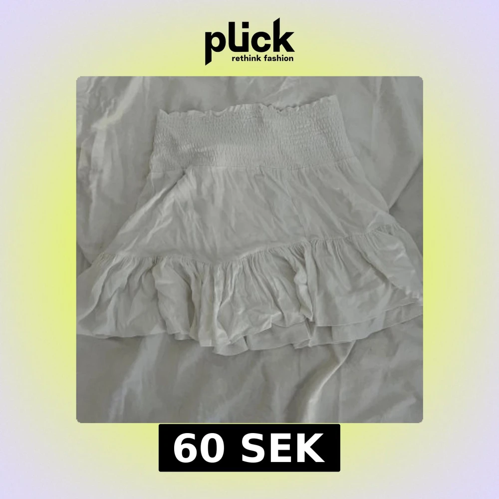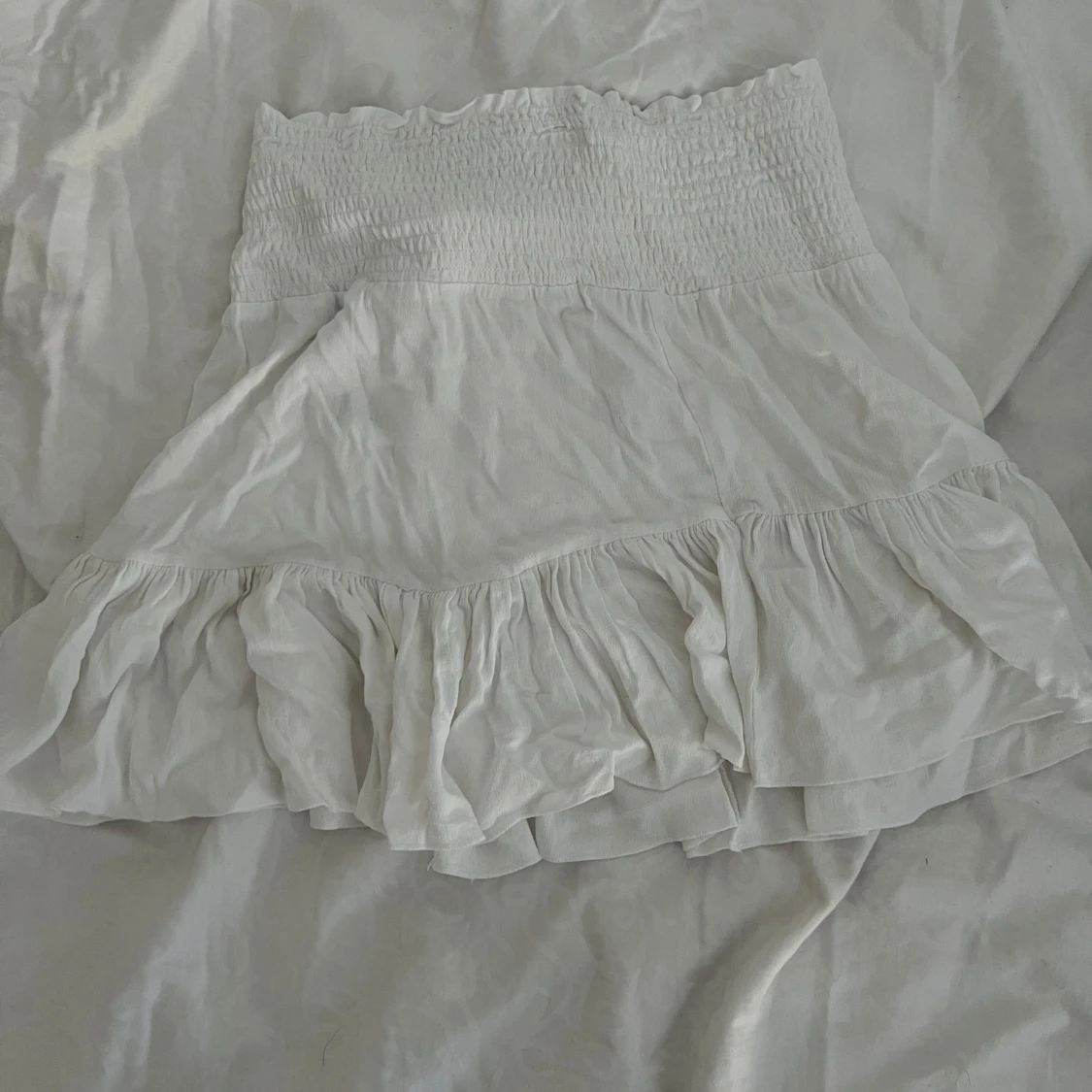 Supersöt vit kjol med bred smock i midjan och volang nertill. Kjolen är kort och har en luftig känsla, perfekt för varma dagar. Passar till många olika stilar och är lätt att matcha med olika toppar.
