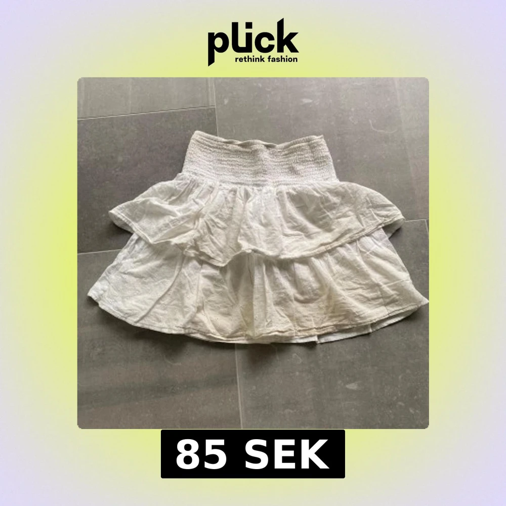 Säljer en söt vit kjol med bred smock i midjan och dubbla volanger. Kjolen är kort och har en luftig känsla, perfekt för varma dagar. Materialet känns lätt och somrigt. Obs lite solblekt