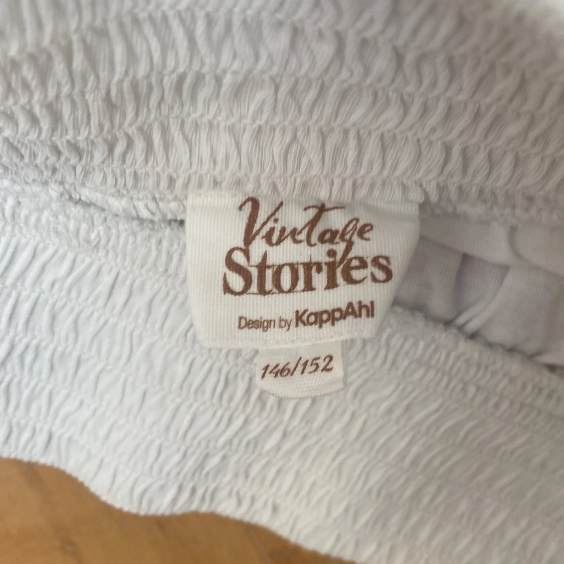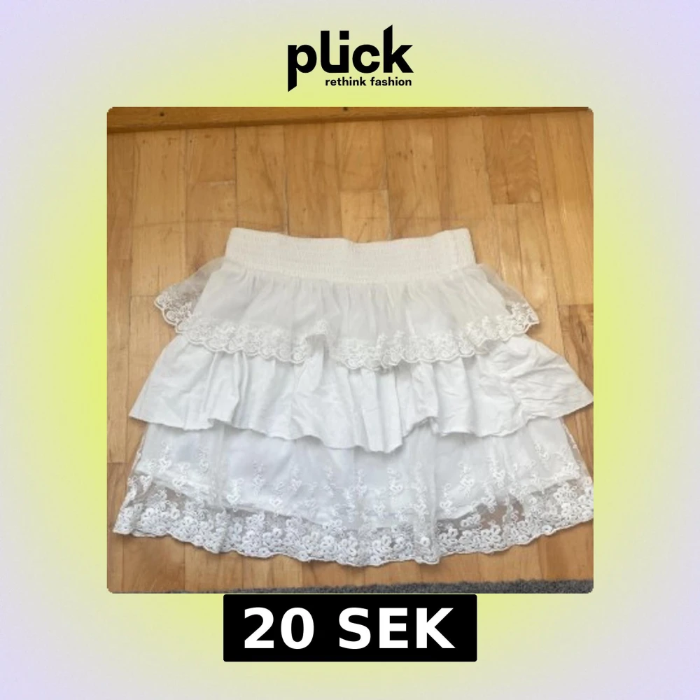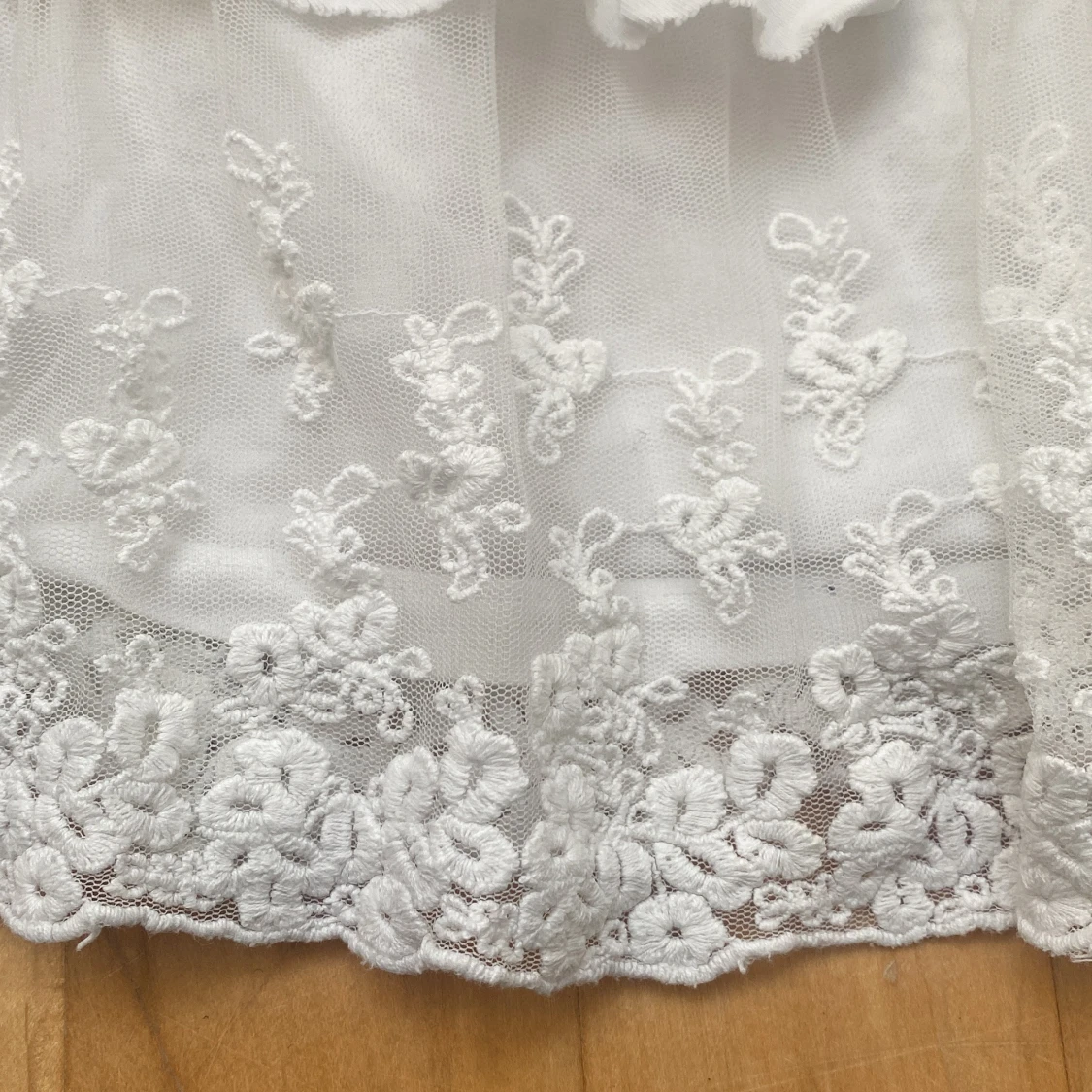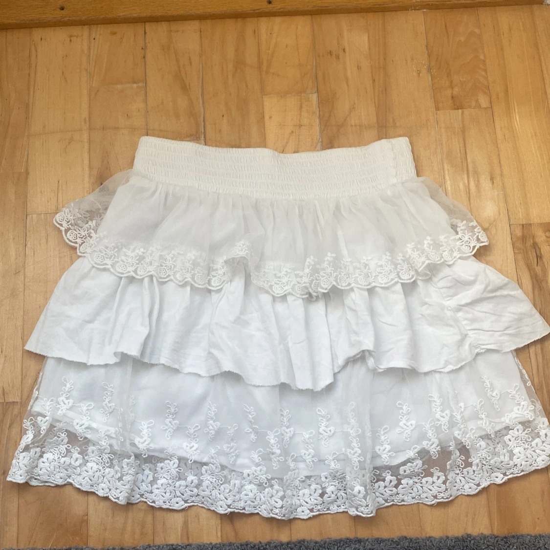 Supersöt vit kjol från Vintage Stories by KappAhl med flera lager volanger och detaljerad spets längst ner. Kjolen har bred resår i midjan och romantiska broderier på tyll. Perfekt för dig som gillar en feminin och drömmig stil.