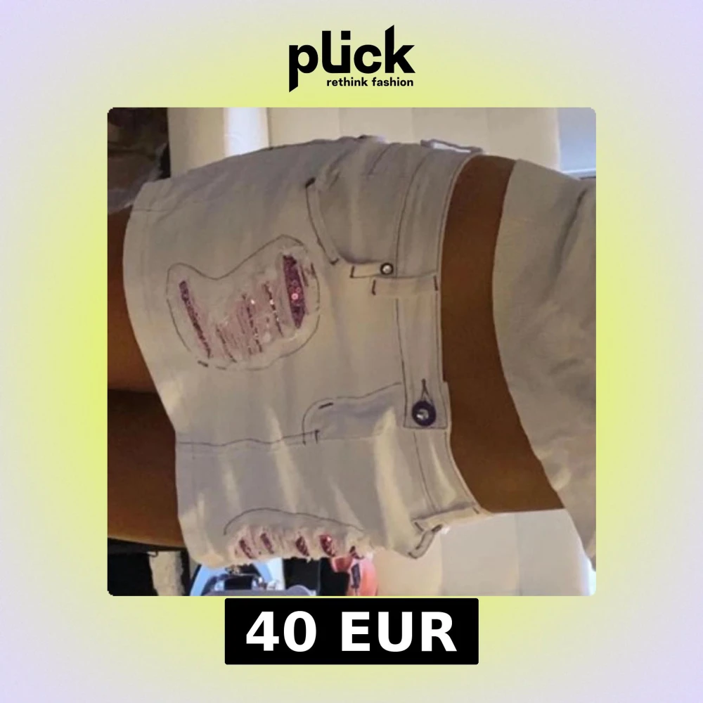 Snygga vita jeanskjol med lila paljettdetaljer och slitna effekter. De har en lågmidjad passform och lila sömmar som ger en unik look. Perfekta för en somrig stil! Storlek xs-s. Köpt från en vintagebutik utomlands