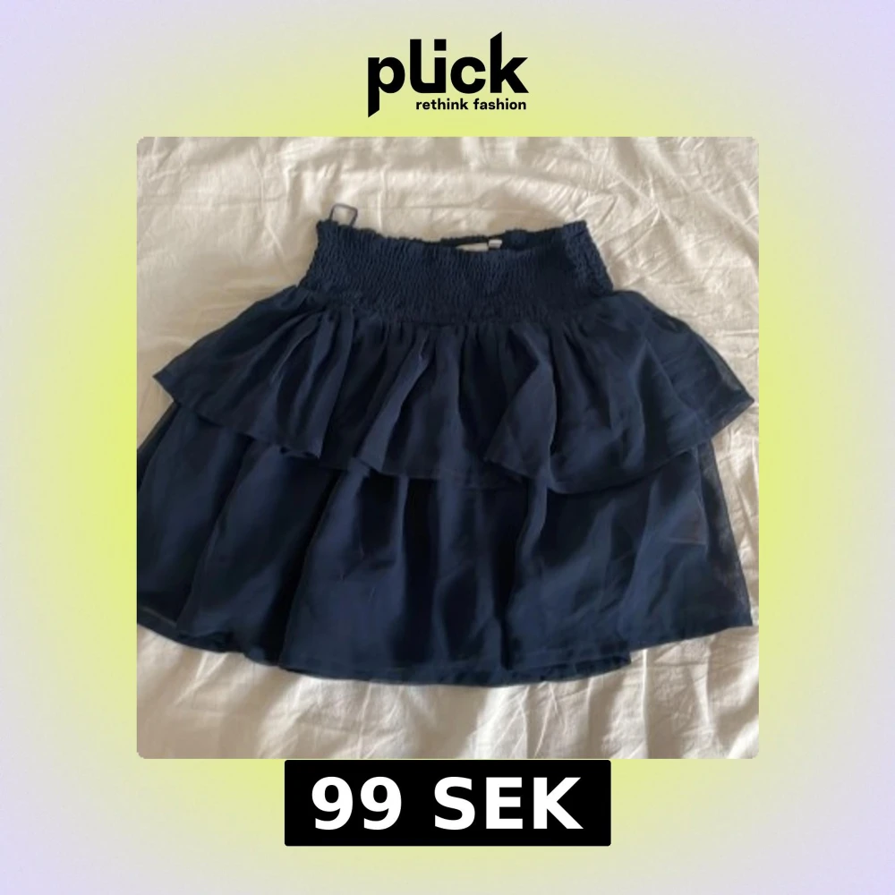 Supersöt mörkblå kortkjol från The New med bred smock i midjan och dubbla lager volanger. Kjolen har en flowy känsla och passar perfekt till sneakers eller sandaler. Materialet känns lätt och luftigt, perfekt för varmare dagar.