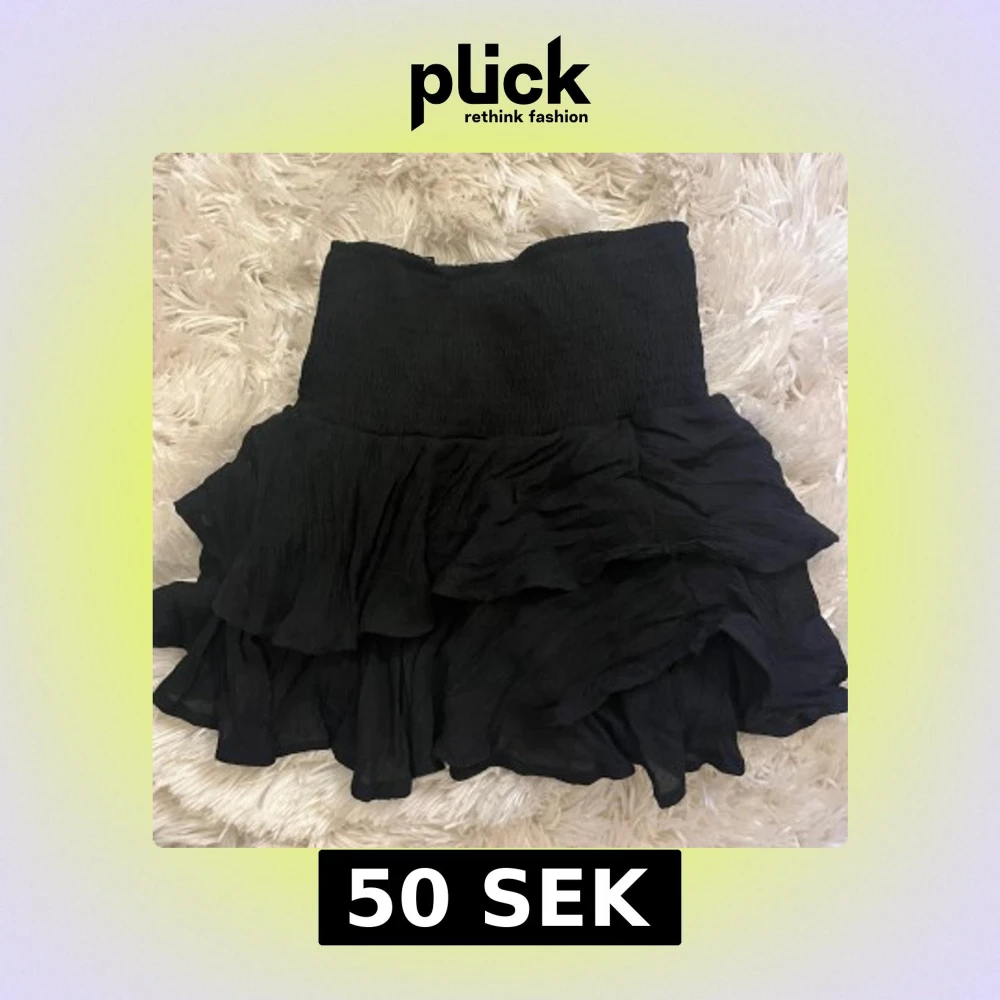 Säljer en svart kortkjol med flera lager volanger. Kjolen har en flowy och luftig känsla, perfekt för att skapa en cool och trendig look. Materialet är lätt och ger snygg rörelse när du går.