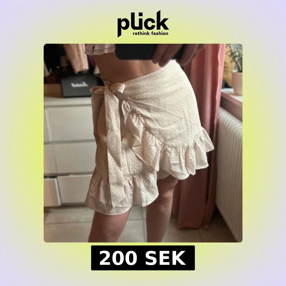 Snygg prickig omlottkjol med volangdetaljer. Finns i både beige och svart med vita prickar. Kjolen har en knytning i sidan och är perfekt för en somrig look. Den korta längden och volangerna ger en lekfull stil.
