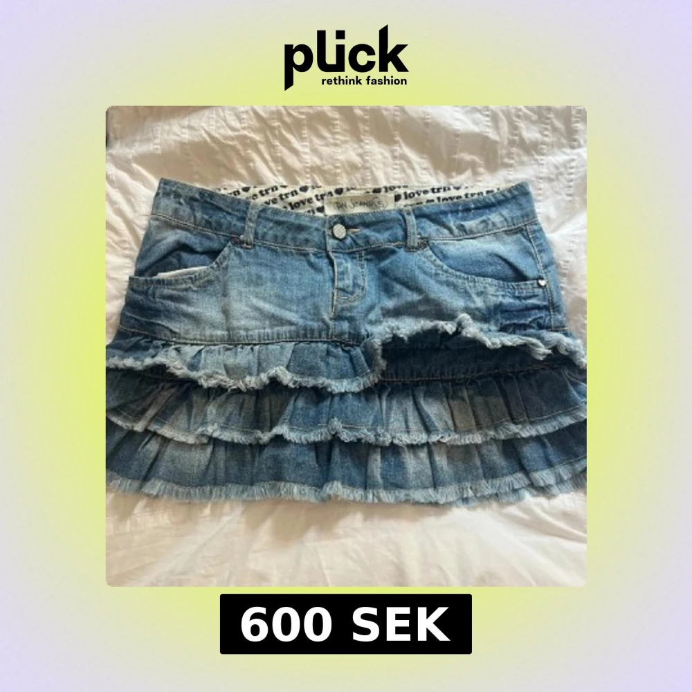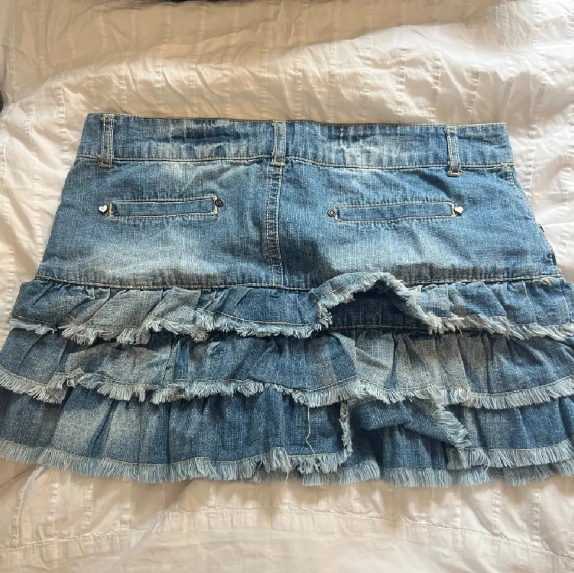 Snygg blå jeanskjol med flera volanglager och fransiga kanter. Klassisk femficksmodell med knapp och dragkedja framtill. Perfekt för dig som gillar en lekfull och trendig stil. Innerlinning med textdetaljer.