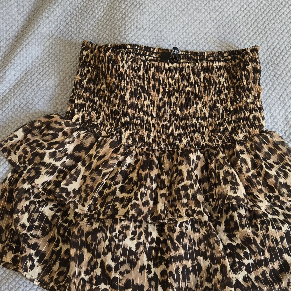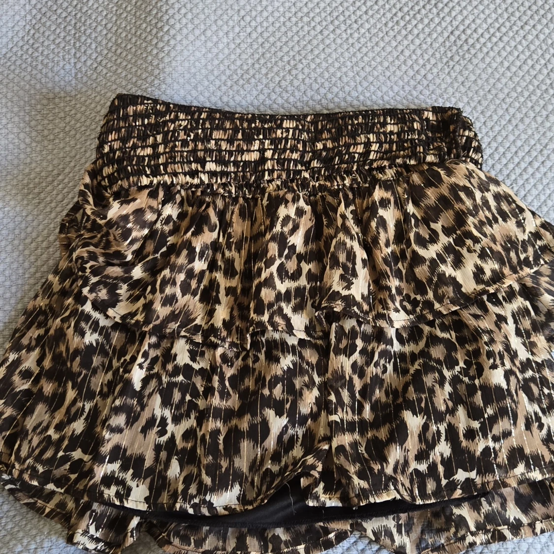 Snygg kort kjol från Sisters Point med leopardmönster i bruna och beige toner. Kjolen har smockad midja och dubbla volanger! Kjolen är stretchig och passar mellan s-L! Kjolen går att ha båda highwaist och low waist och går att vika ner kanten för ännu mer low waist! Skriv om du har några frågor eller om du vill köpa/ är intresserad av att köpa!! Pris kan diskuteras!🫶