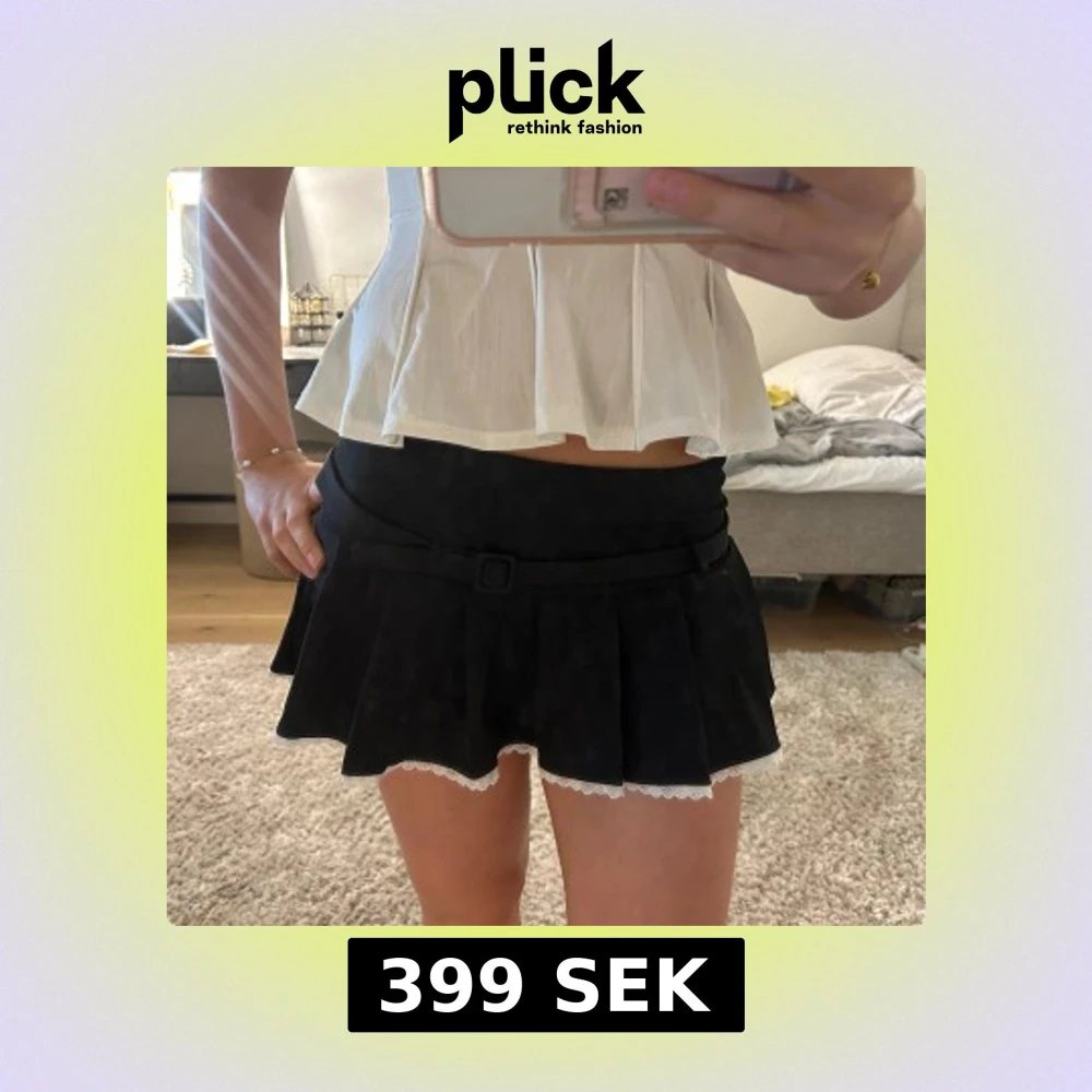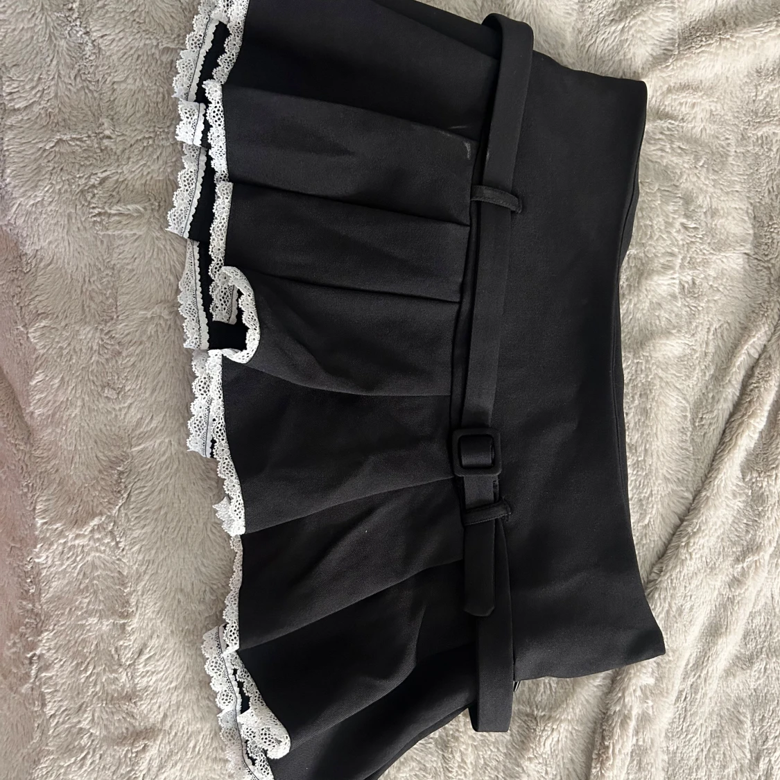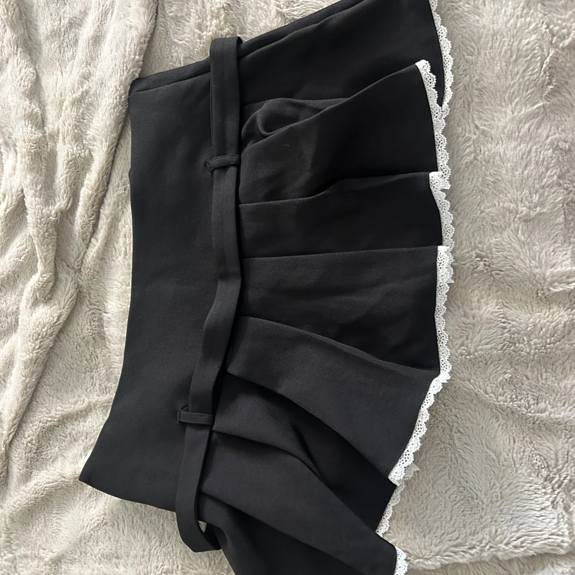 Supersöt svart kortkjol med plisserad design och vit spetskant längst ner. Kjolen har ett smalt bälte i midjan som ger extra detalj. Perfekt för dig som gillar en söt och trendig stil. Den är oanvänd med prislapp kvar