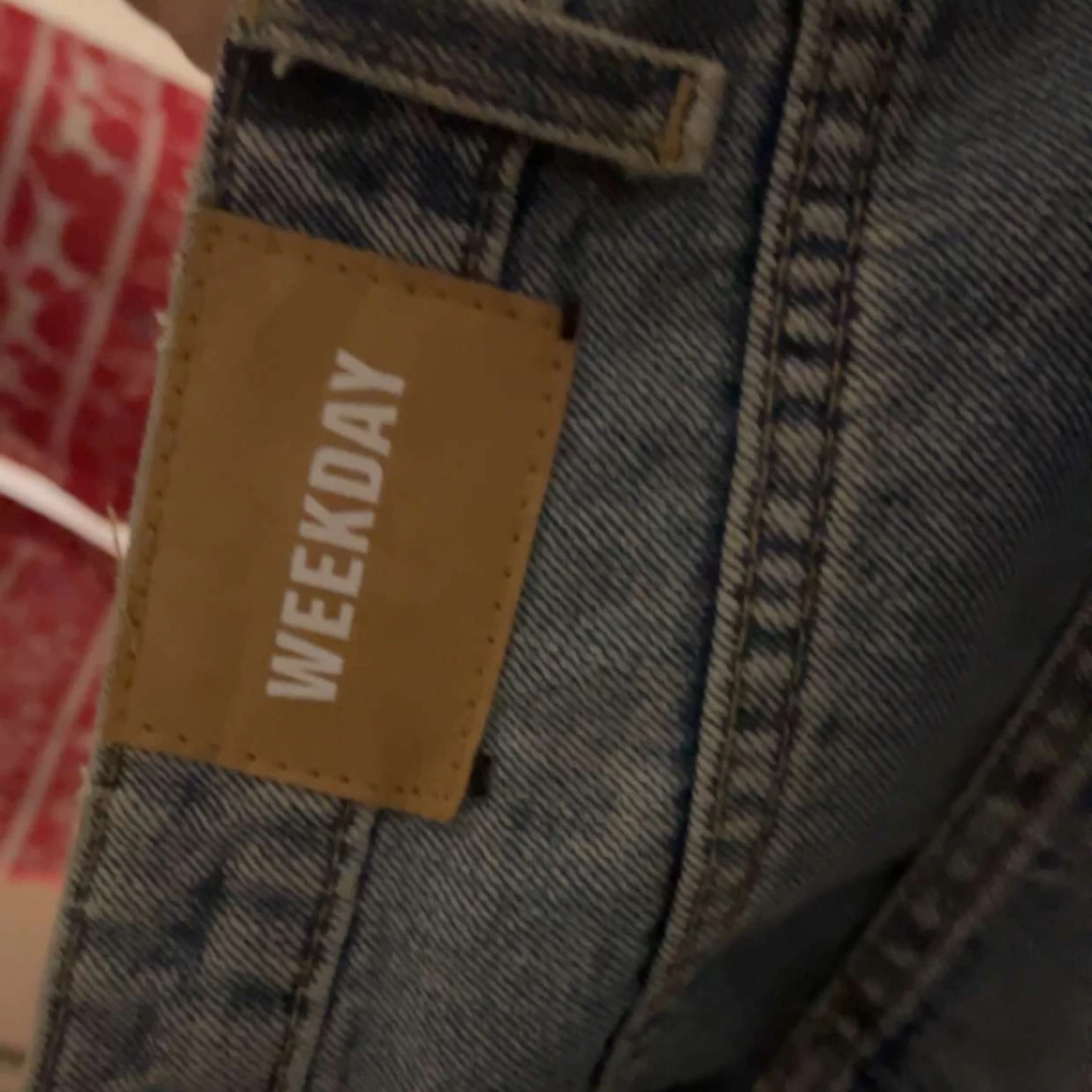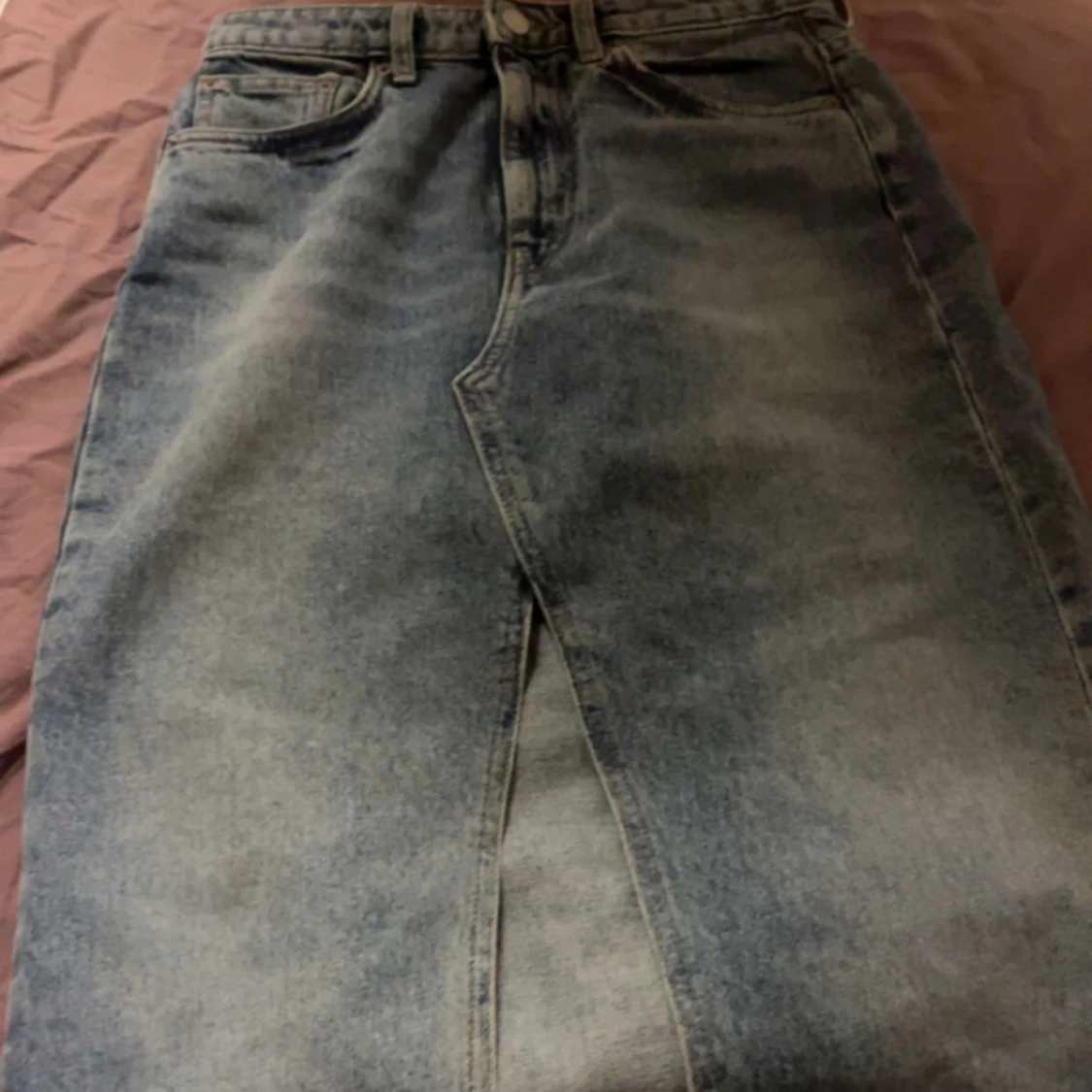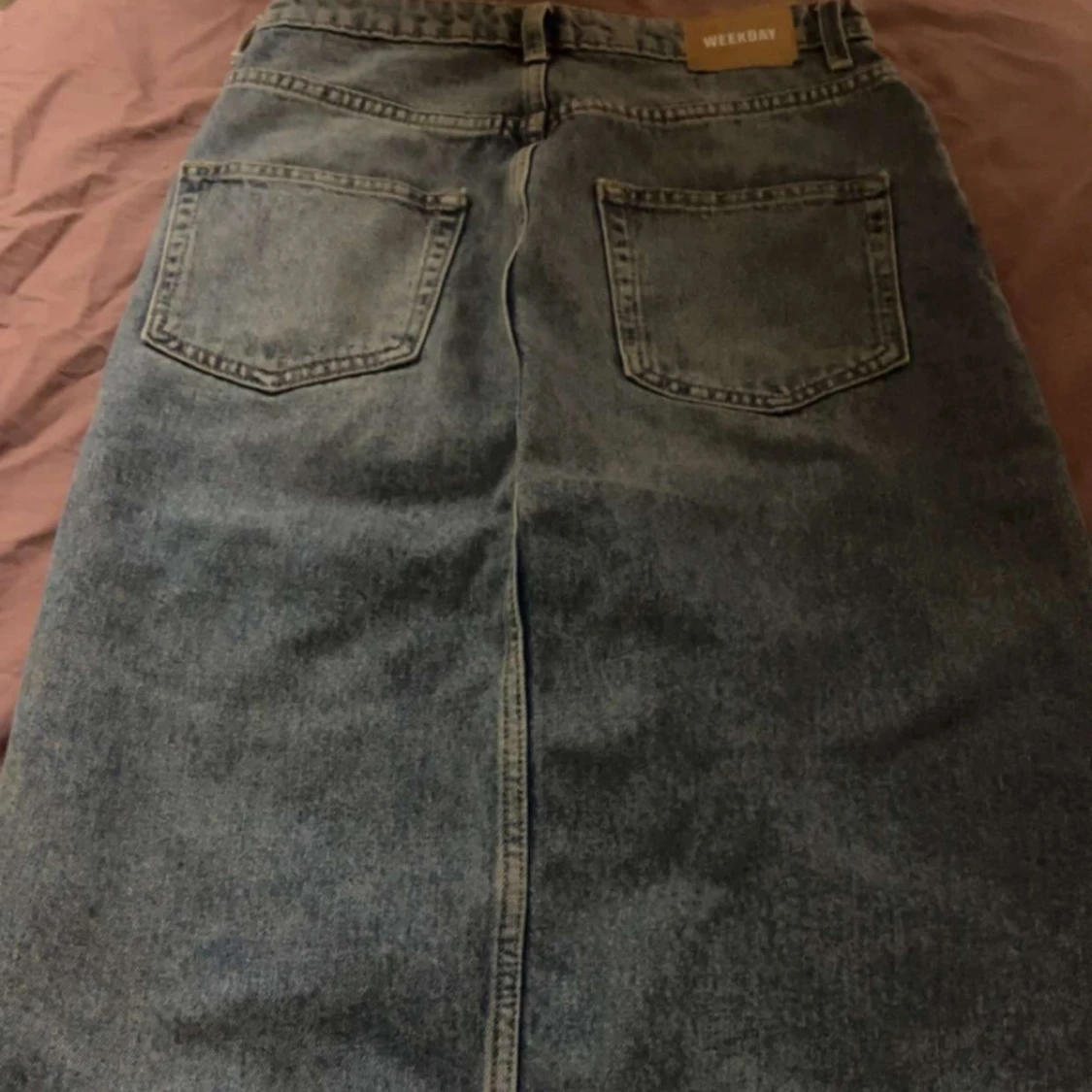 Snygg blå jeanskjol från Weekday med klassisk femficksdesign och en stilren slits framtill. Perfekt för en sommaroutfit. Kjolen har en medellång längd och är tillverkad i slitstarkt denim.