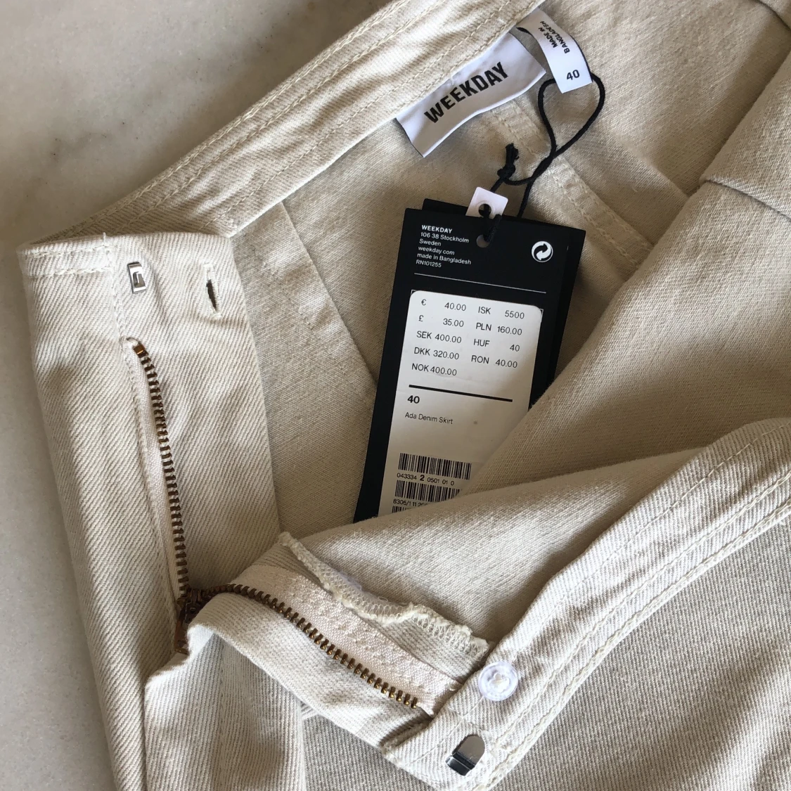 Helt oanvänd benvit jenanskjol med snörning framtill från Weekday. Dragkedja i sidan. Nypris 400kr, lapparna kvar. Strl 40 & jag har vanligtvis strl M✨ Frakten är spårbar och inräknad i priset!