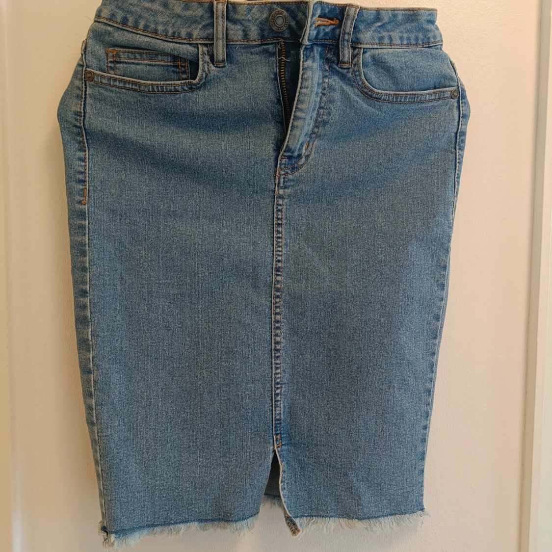 Säljer en snygg blå jeanskjol från Noisy May i klassisk denim med fransad kant och slits framtill. Kjolen har normal passform, fem fickor och knapp- samt dragkedja i midjan. Perfekt för dig som gillar en chill och trendig stil.