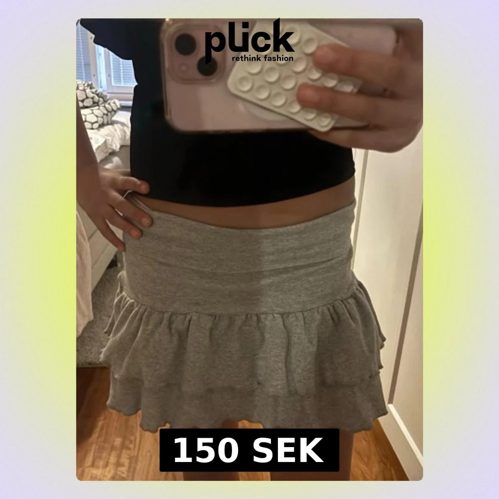 Supersöt grå kortkjol med volangkant. Kjolen har en bred midjeresår och är gjord i mjukt bomullstyg som är bekvämt att bära. Perfekt till sommaren. Aldrig använt. Vet inte vart den är ifrån. Stork XS men passar typ alla storlekar för den är väldigt stretchig. Dock igen prislapp kvar.