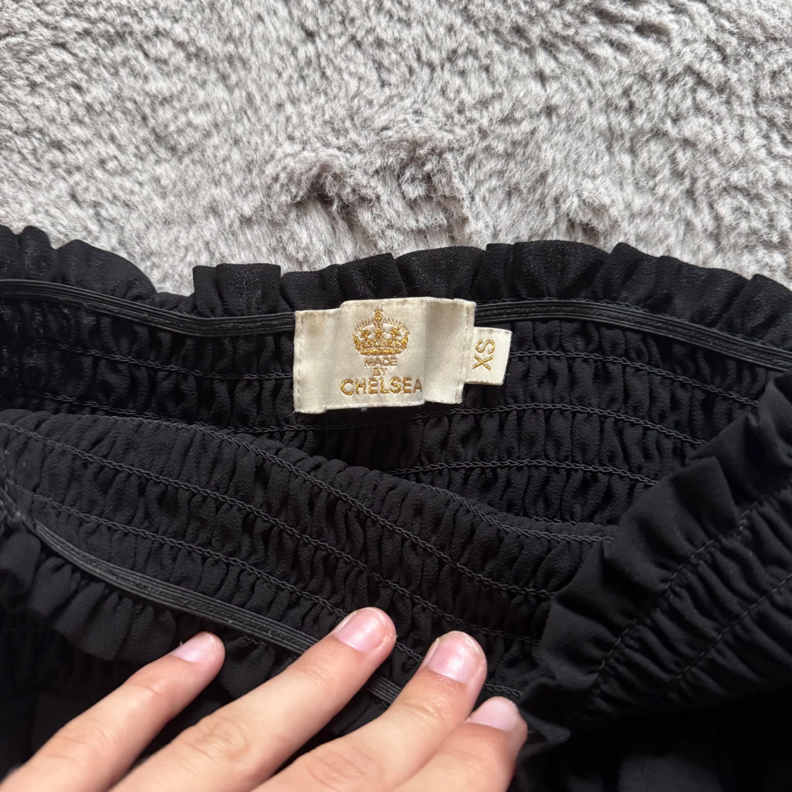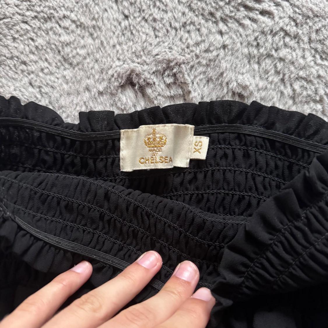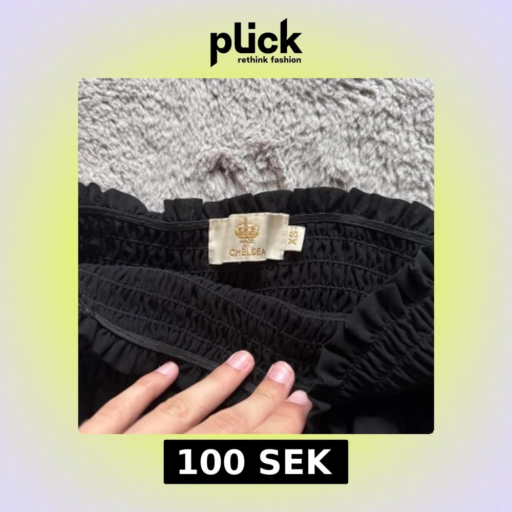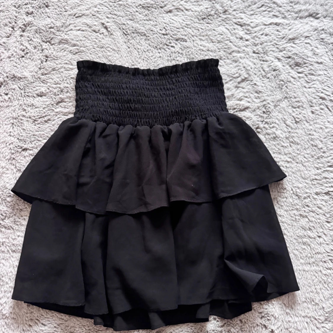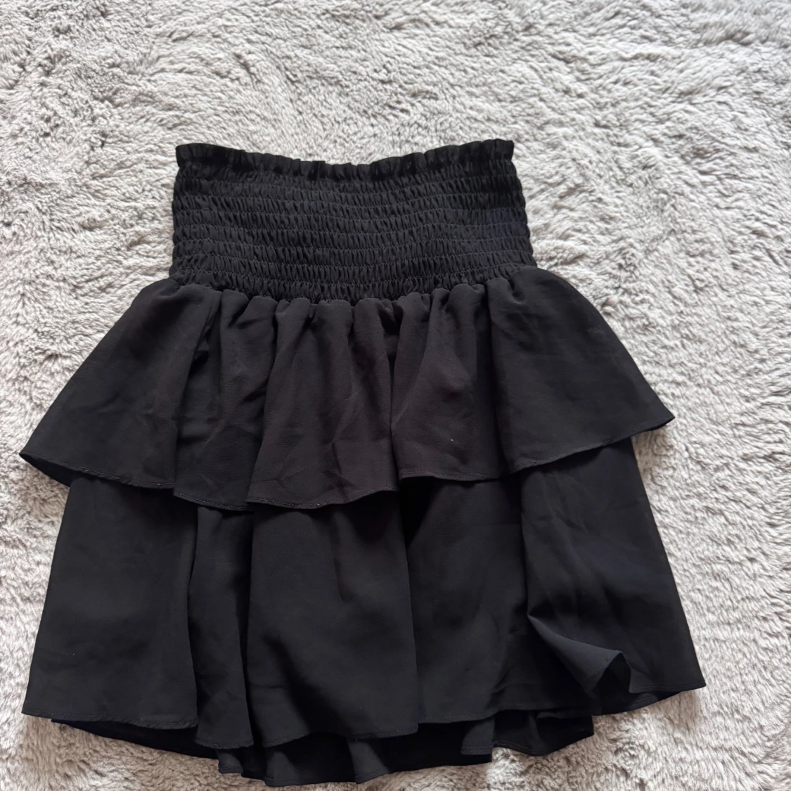 Supersöt svart kortkjol från Chelsea med bred smock i midjan och dubbla volanger. Köpt i Chelsea affär och används några par gånger. Säljer pågrund av att den inte kommer mer till användning.