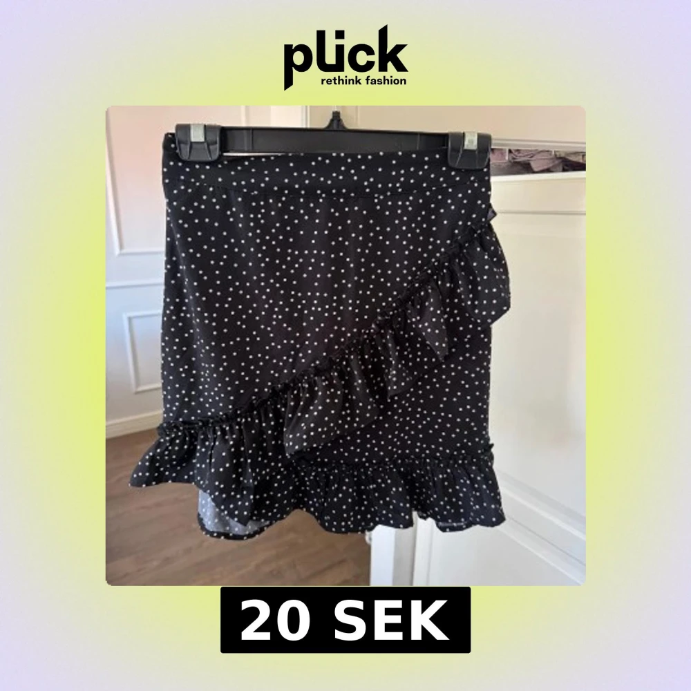 Supersöt svart kortkjol med vita prickar och volangdetaljer.