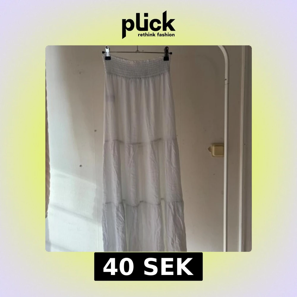 Säljer en flowy vit långkjol med bred smock i midjan. Kjolen har flera volanger och är gjord i ett tunt, lätt tyg som ger en luftig känsla. Perfekt för varma dagar och enkel att styla med crop tops eller linnen.