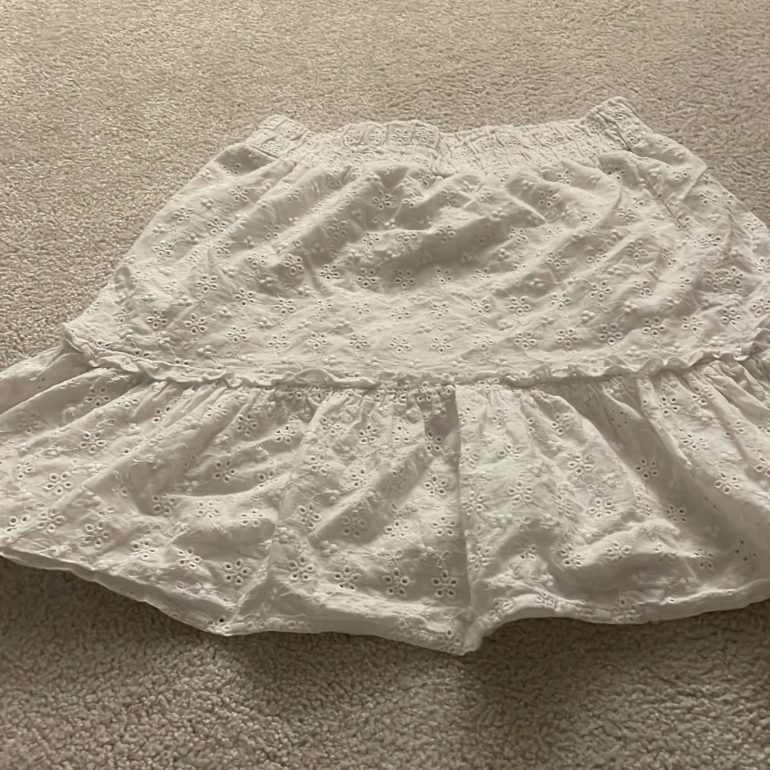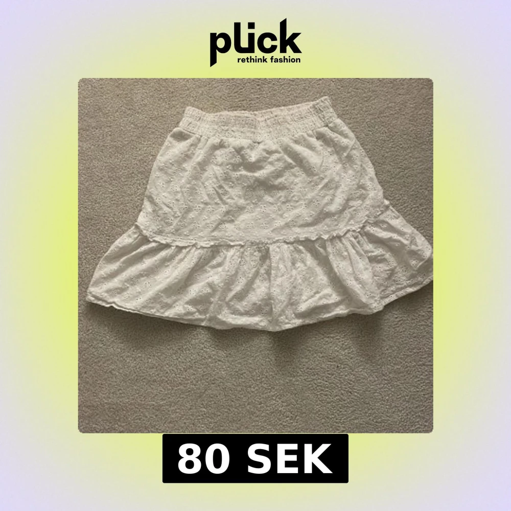 Söt vit kjol med volang och broderade blommor. Resår i midjan för skön passform och luftig känsla. Perfekt för varma dagar och enkel att matcha med olika toppar.