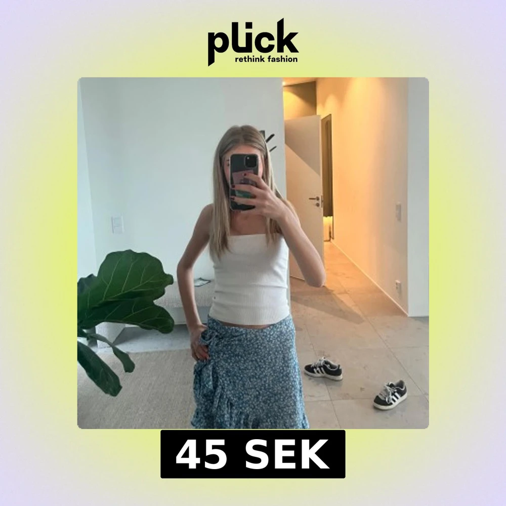Säljer en blå omlottkjol med vitt blommönster och volangkant. Kjolen har knytband i midjan och är i en lätt och luftig kvalitet, perfekt för varmare dagar. Kjolen är kort och har en feminin och somrig stil.