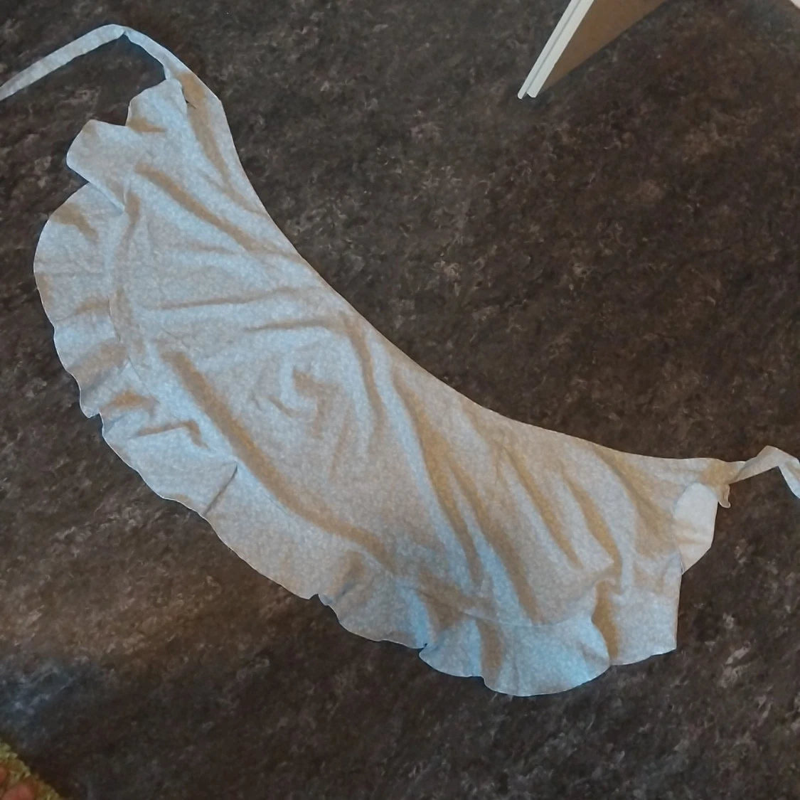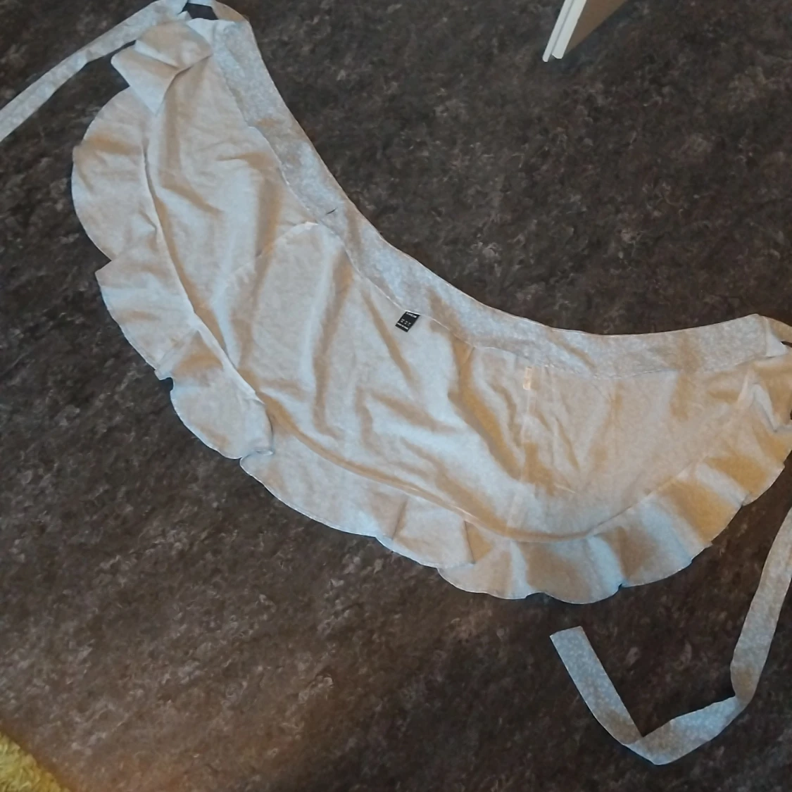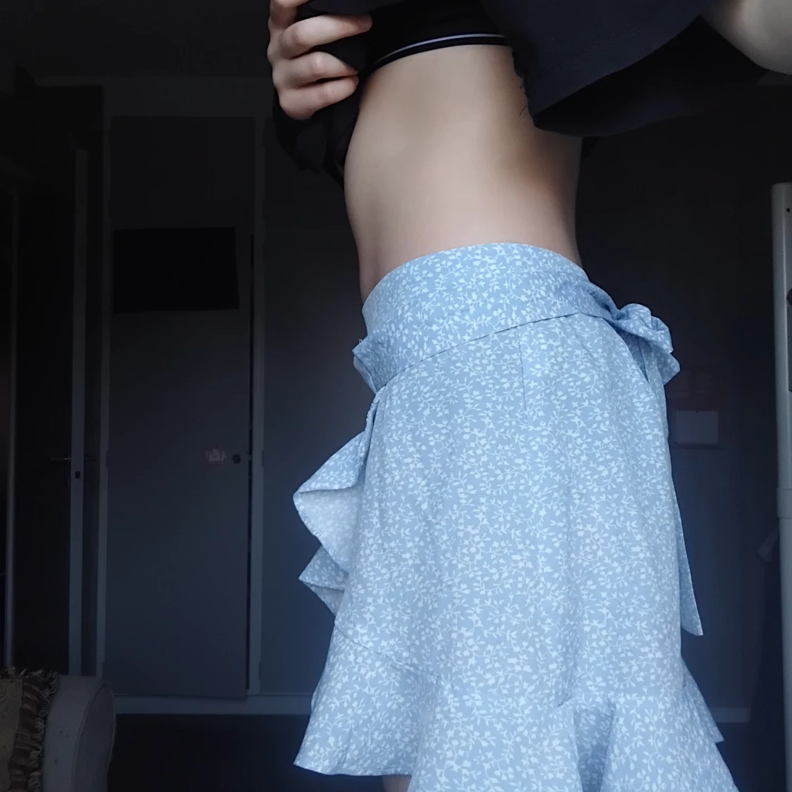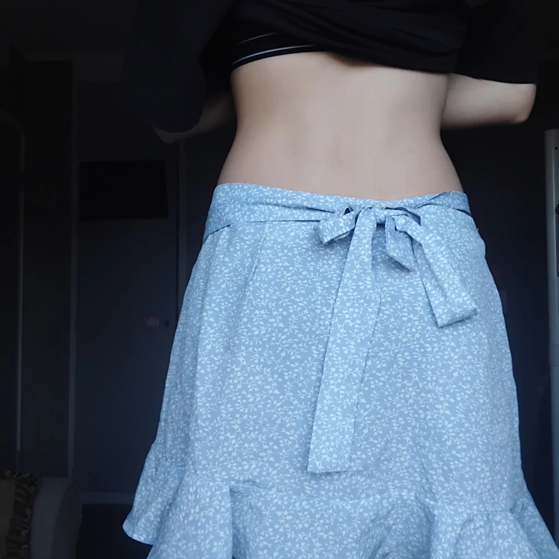 Supersöt ljusblå kort omlottkjol med små vita blommor. Kjolen har volangkant och knyts i midjan med en rosett bak. Perfekt för varma dagar och ger en fräsch och somrig vibe.