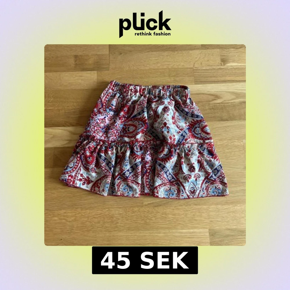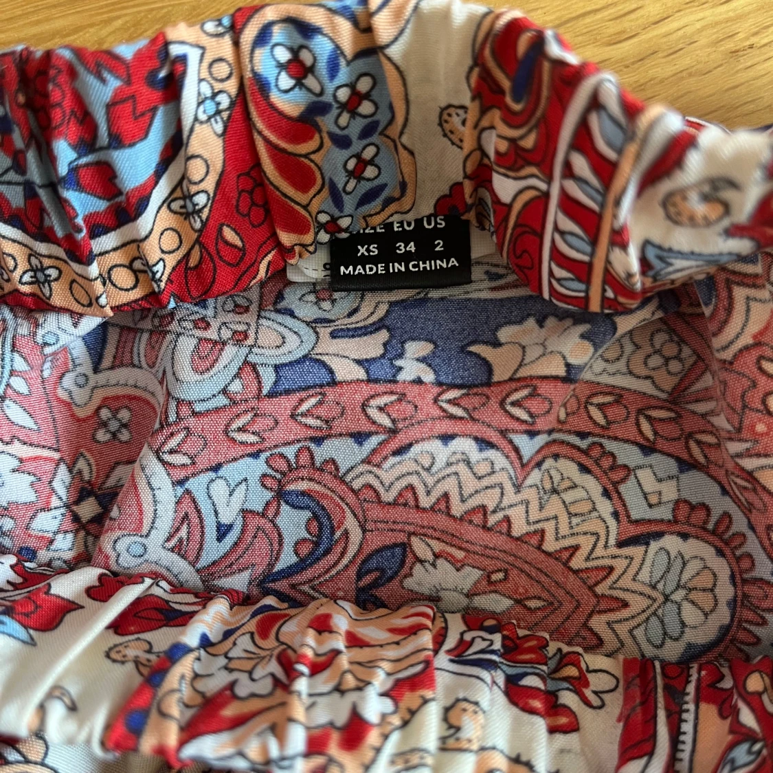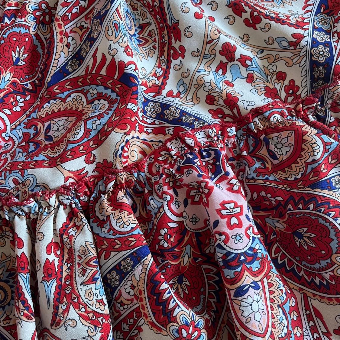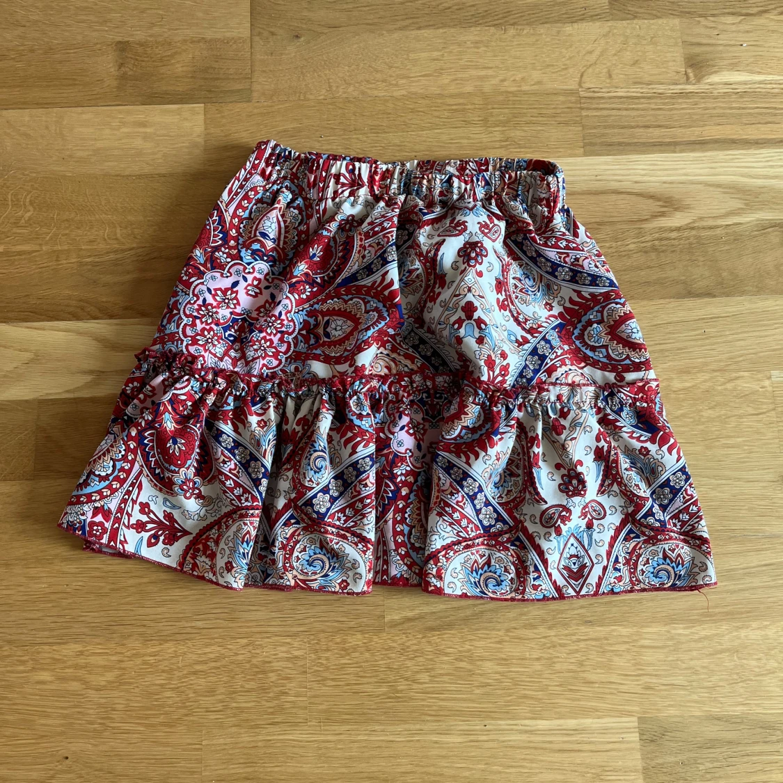 Kortkjol i storlek XS med färgstarkt paisleymönster i rött, blått och vitt. Kjolen har volangdetalj och resår i midjan för en bekväm passform. Perfekt för dig som gillar boho-vibe och vill sticka ut med coola mönster.
