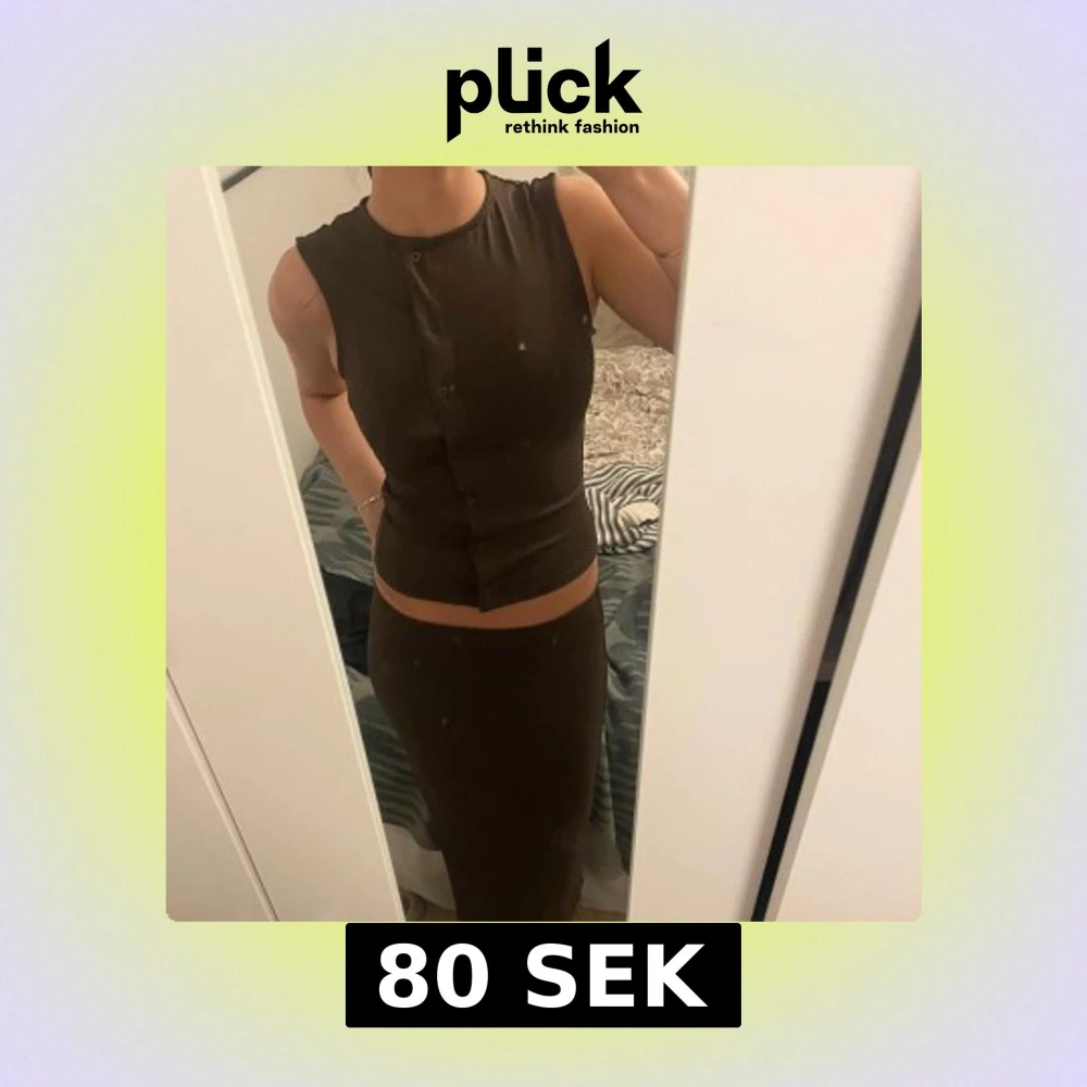 Säljer brunt sett med asymmetriska knappar fram till. En lång kjol med tillhörande topp, tight passform och en stilren look. Helt oanvänt!
