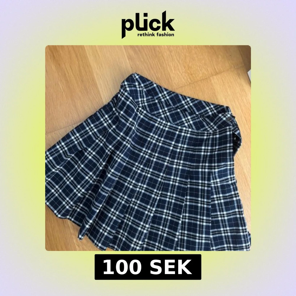 Supersnygg mörkblå plisserad kortkjol med vitt och grått rutmönster.