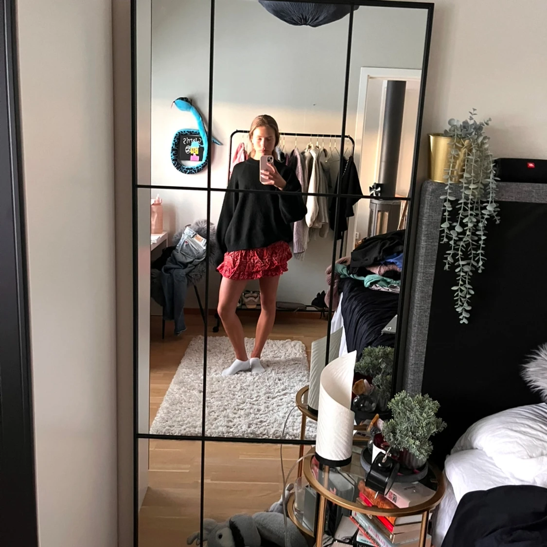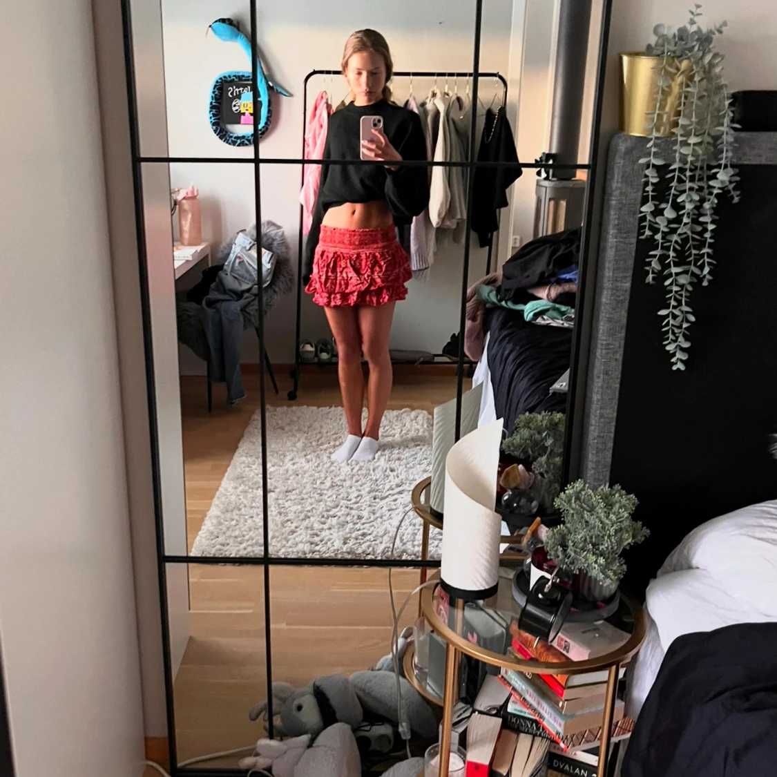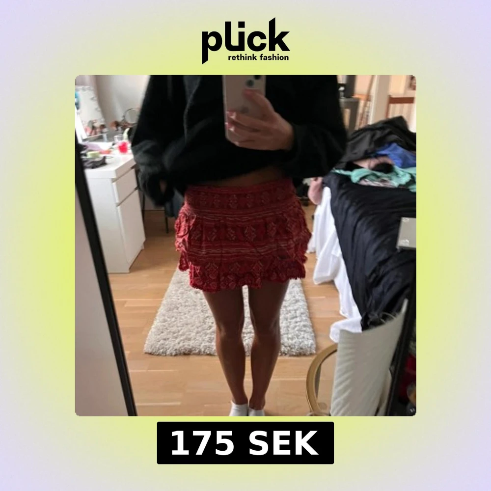 Trendig röd kortkjol med volanger och ett snyggt mönster. Perfekt för att ge en färgklick till din outfit. Kjolen har en omlott-design som ger en extra touch av stil.