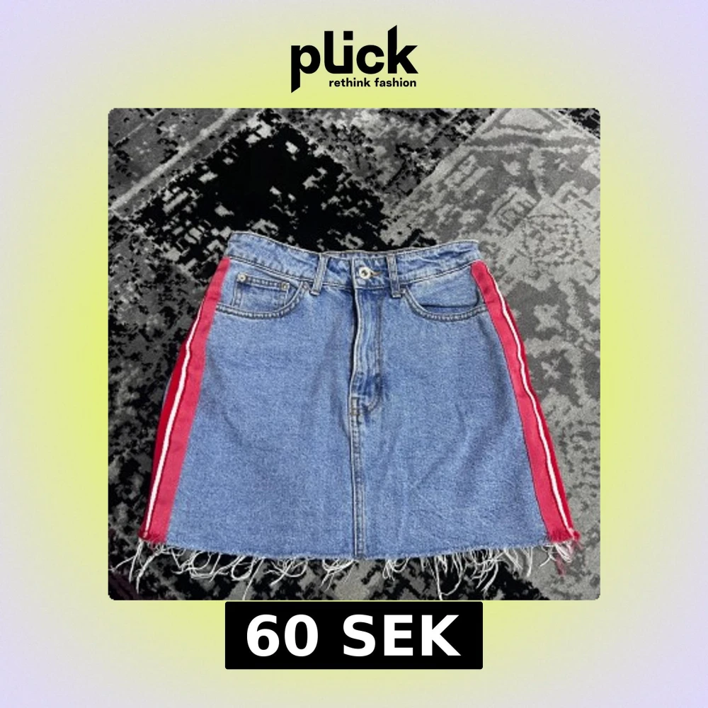 Snygg jeanskjol från Authentic Denim med röda och vita ränder på sidorna. Kjolen har en fransig nederkant och klassiska femficksdetaljer. Perfekt för en avslappnad stil.