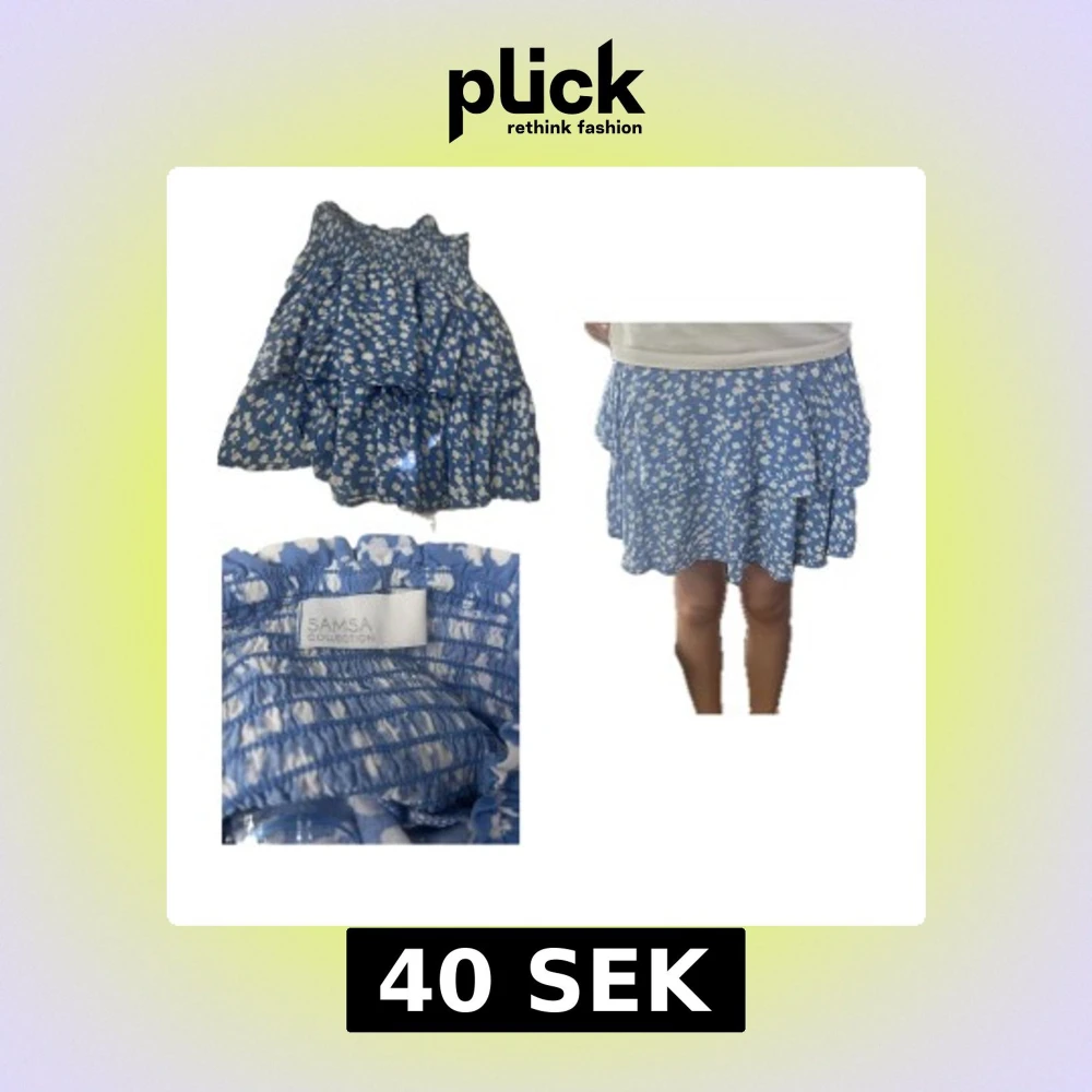 Supersöt blå kortkjol med vita blommor från Samsa Collection. Kjolen har volanger och resår i midjan för en bekväm passform. Perfekt för dig som gillar en feminin och lekfull stil. Lätt och luftig, passar perfekt till varma dagar.