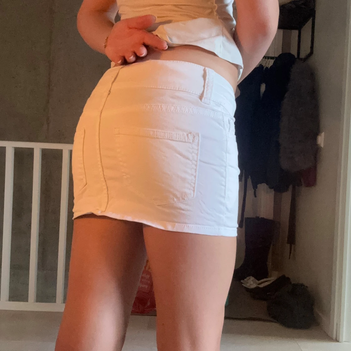 Säljer en vit kortkjol i jeansstil med två framfickor, bakfickor och dubbla silverfärgade knappar i midjan. Kjolen har dragkedja framtill och är gjord i ett bomullsmaterial med lite stretch. Perfekt för dig som gillar en clean och fräsch look. Tyvärr alldeles för liten för mig🥲