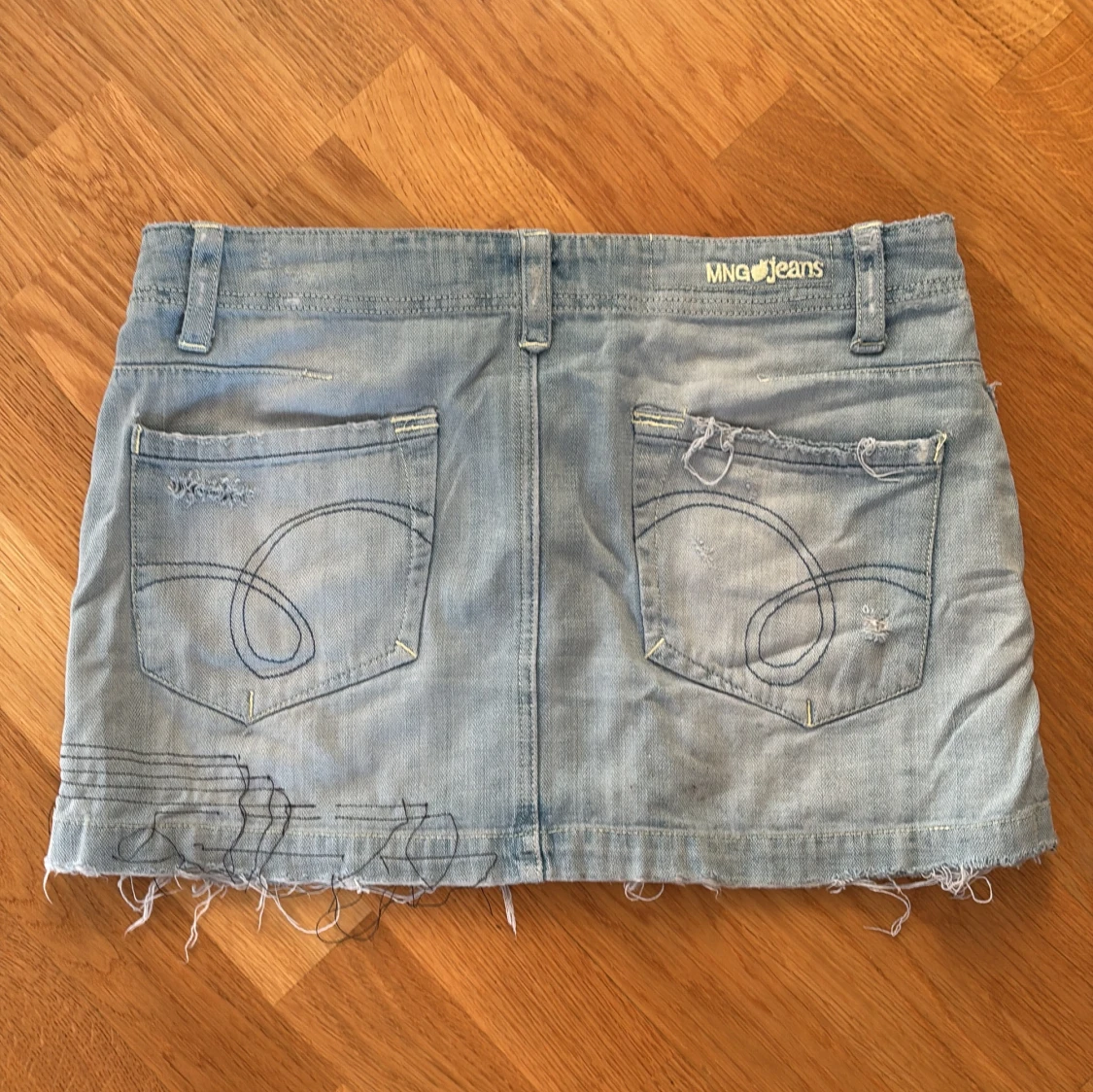 Säljer en cool ljusblå jeanskjol från Nina Jeans med slitna detaljer och rå kant. Kjolen har fem fickor och en knapp- och dragkedjestängning framtill. Perfekt för en avslappnad stil!