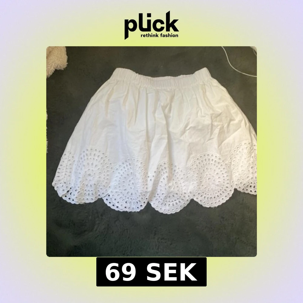 Supersöt vit kortkjol från C i storlek XS. Kjolen har en elastisk midja och en broderad spetskant med snygga hålmönster längs nederdelen. Perfekt för sommarens alla tillfällen när du vill känna dig extra fräsch och stylish.