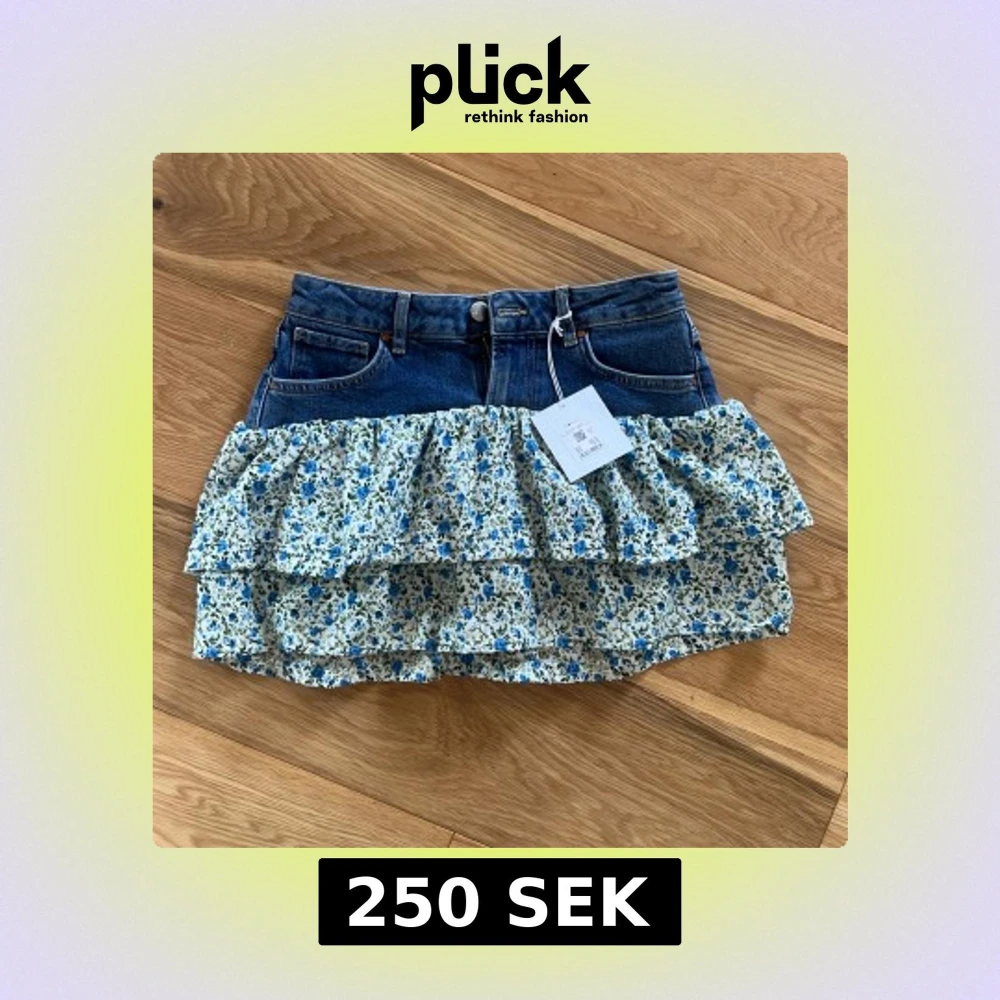 Supersöt kort jeanskjol med volanger i blommigt tyg. Kjolen har klassisk jeansmidja med fickor och knäppning, och volanger i vitt tyg med blå och gröna blommor. Perfekt för dig som vill sticka ut med en mix av denim och romantiska detaljer.