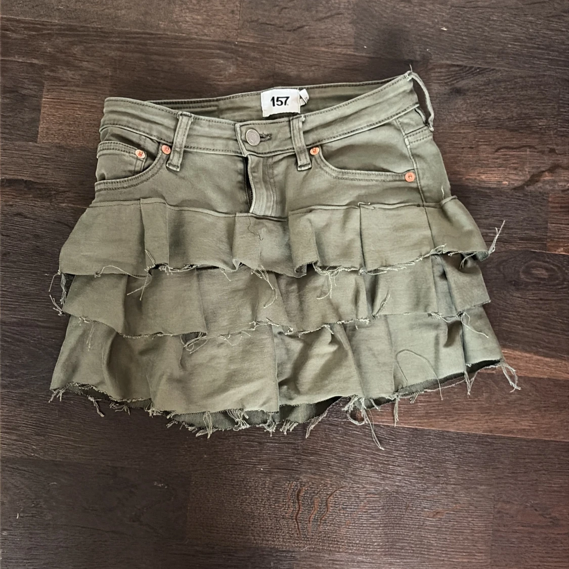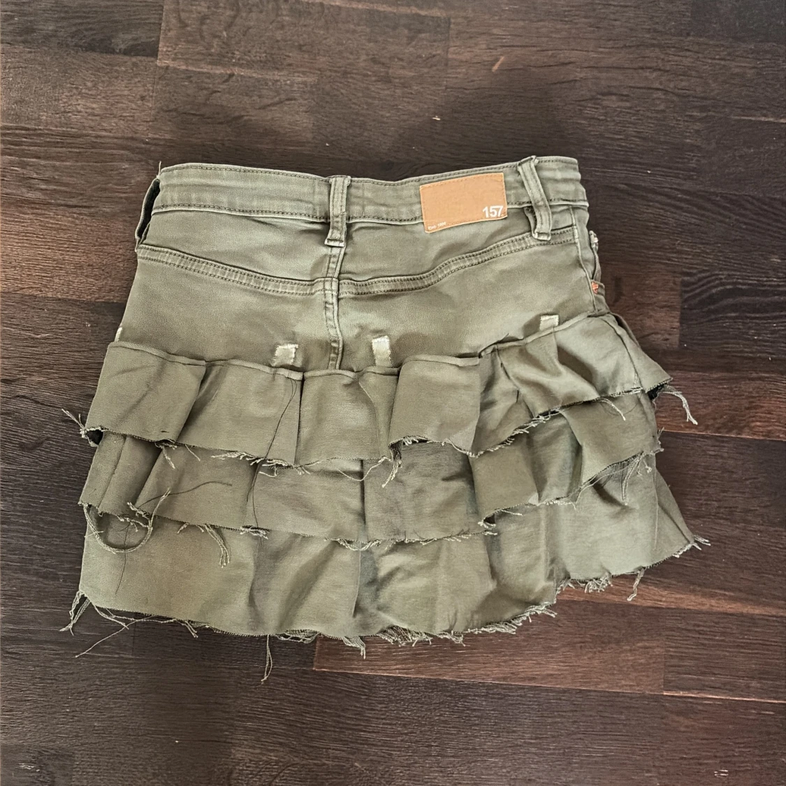 Olivgrön kortkjol med flera lager av volanger. Kjolen har klassiska jeansdetaljer som fickor och bälteshällor. Jag har sytt om den från ett par jeans. Perfekt för dig som gillar en trendig stil. (Den har aldrig används)