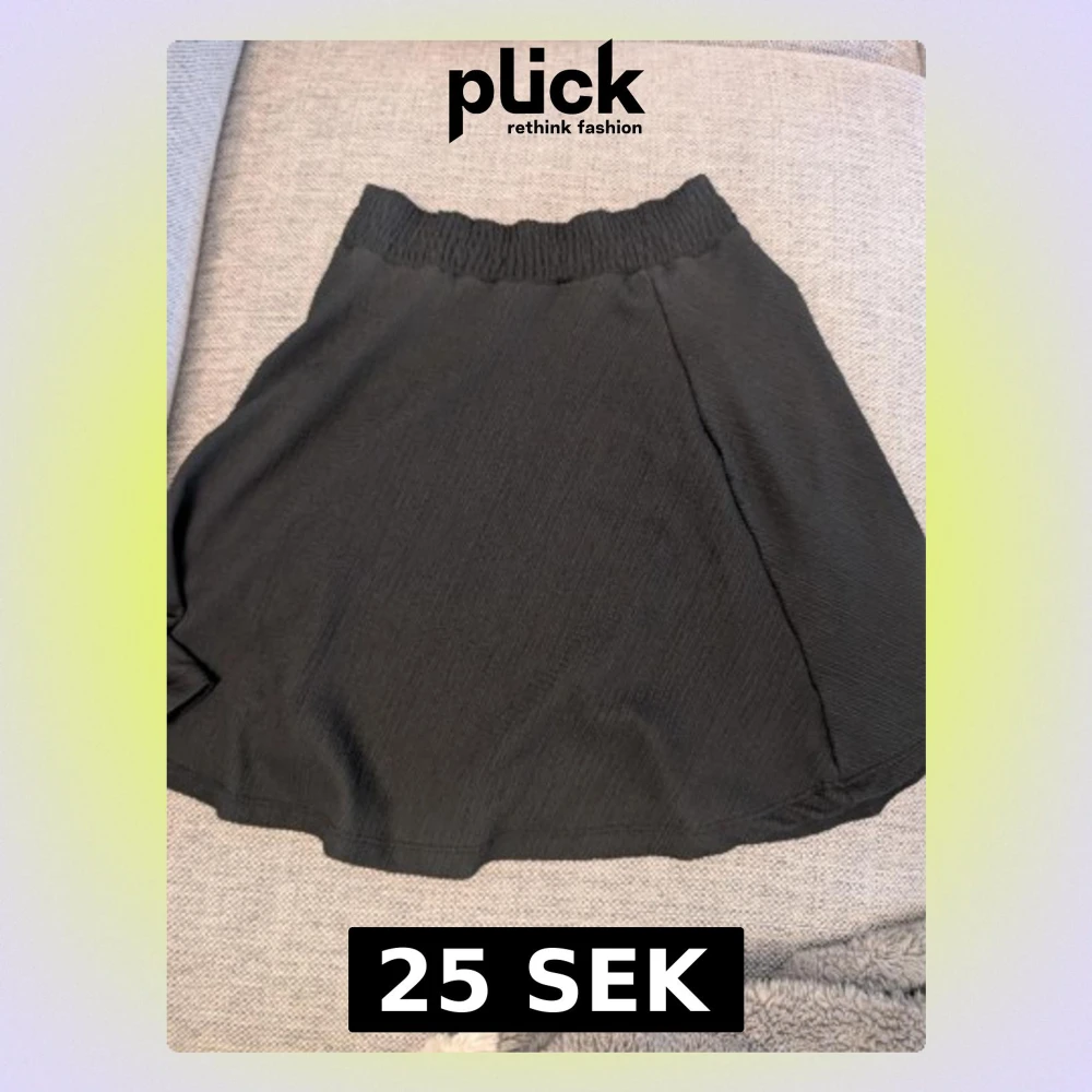 En svart kortkjol med ribbad resår i midjan och lätt struktur i tyget. Kjolen har en enkel och stilren design som är lätt att matcha med olika toppar. Materialet känns mjukt och har en diskret textur som ger kjolen en cool look.