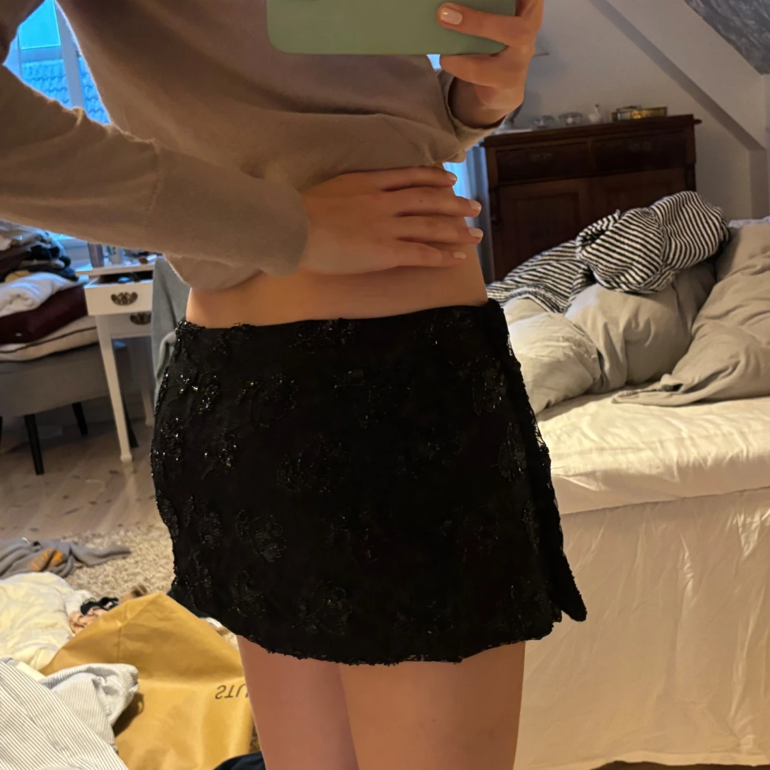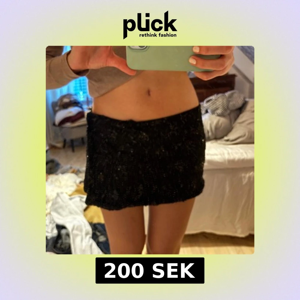 Mini kjol med glitter och paljetter i svart, passar xs. Ganska kort modell, jag hade shorts under bör jag använde den.