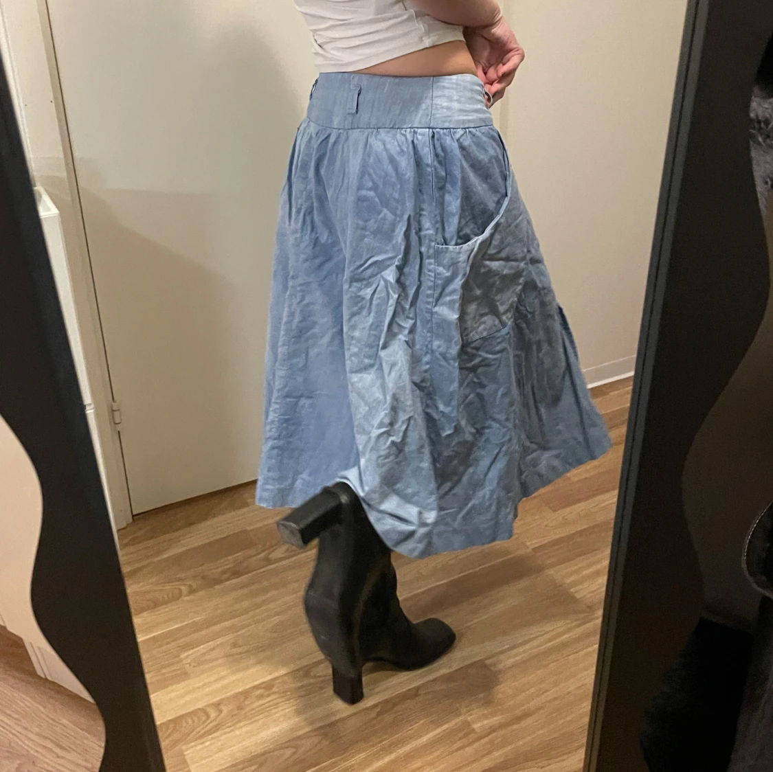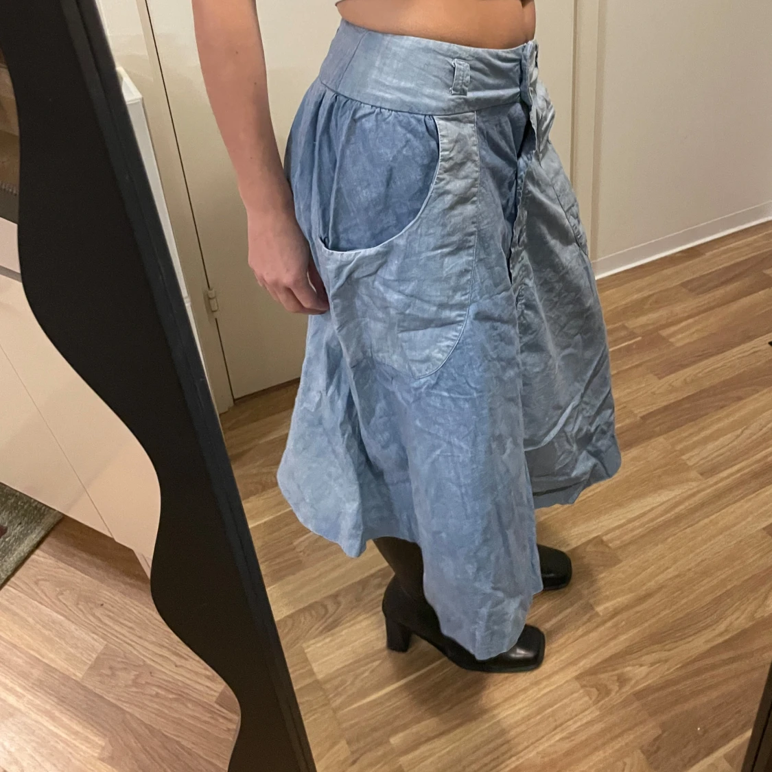 Säljer en blå kjol med knappar framtill och stora fickor. Finns fickor. Finns inget märke eller storlek men jag är 160cm och när Xs
