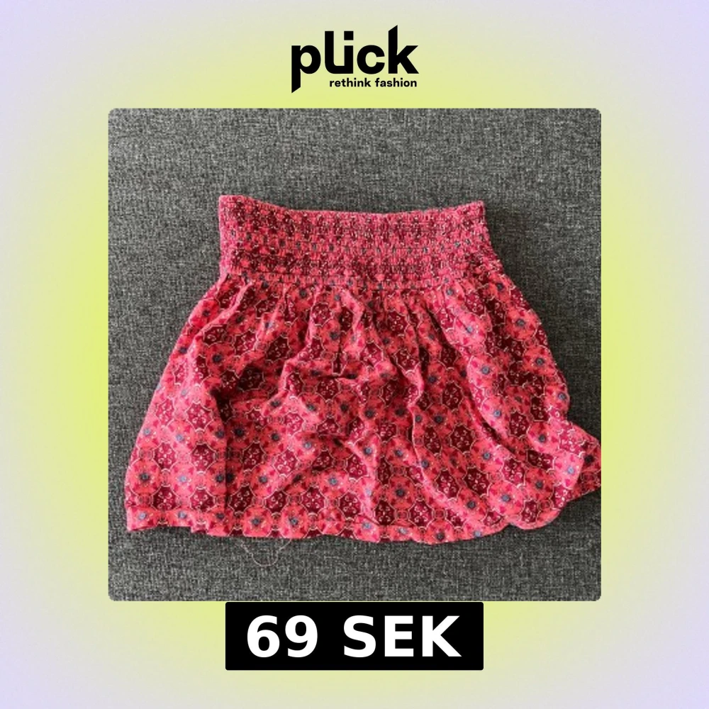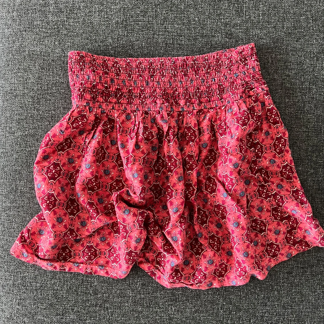 Supersöt kortkjol i rosa med ett färgstarkt mönster och smockad midja. Kjolen har en luftig och flowy passform. Köpt på en marknad i spanien