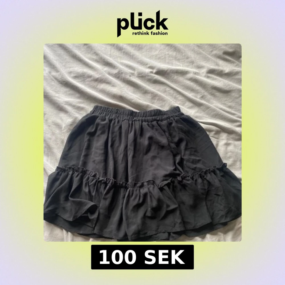 Supersöt svart kortkjol med volang och resår i midjan. Kjolen har en luftig och flowy känsla, perfekt för att styla med en crop top eller oversized hoodie. Enkel men ändå trendig design som passar till sneakers eller boots.