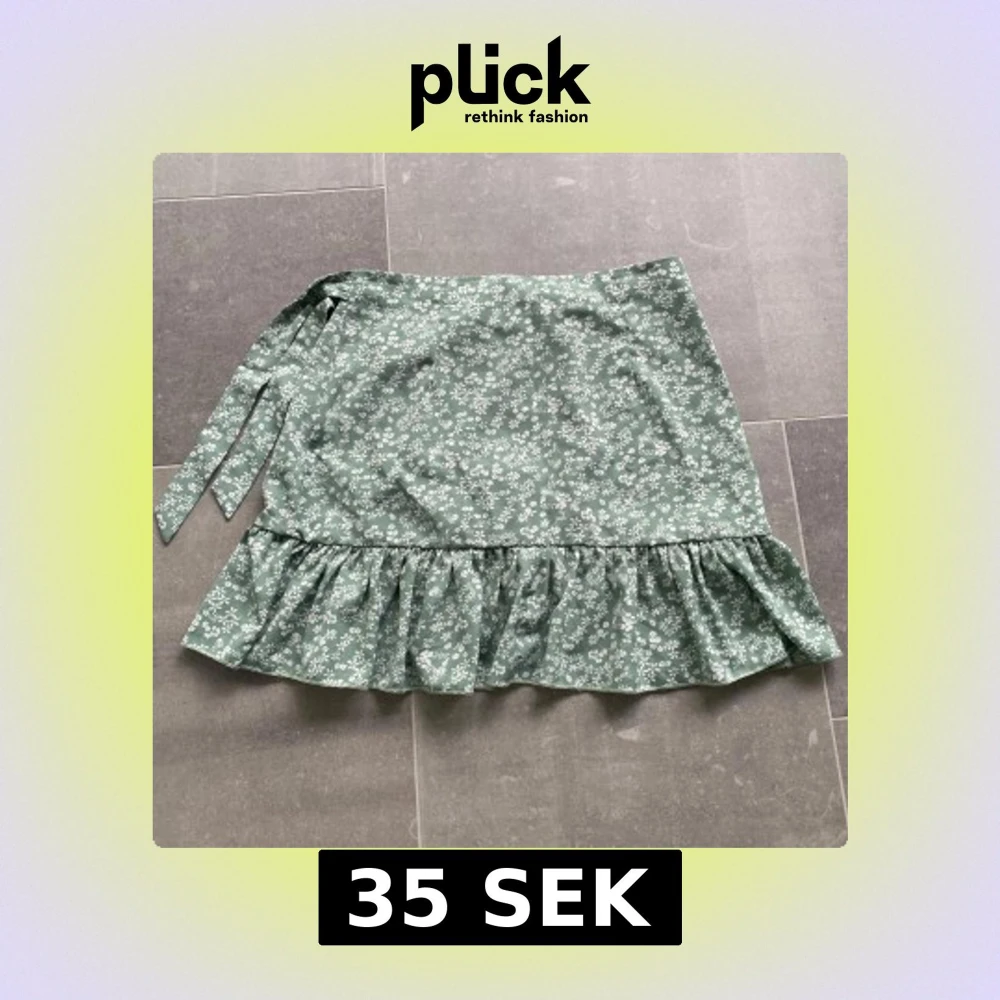 Supersöt grön kjol med vitt blommönster och volang längst ner. Kjolen har omlottmodell med knytband i midjan och är perfekt för en somrig look.
