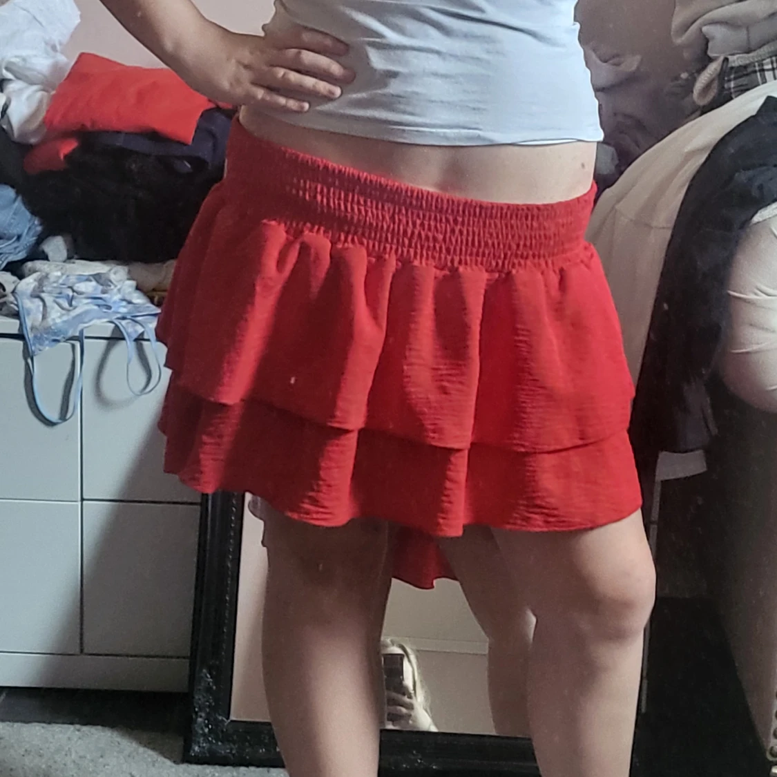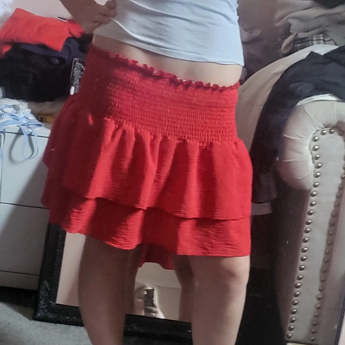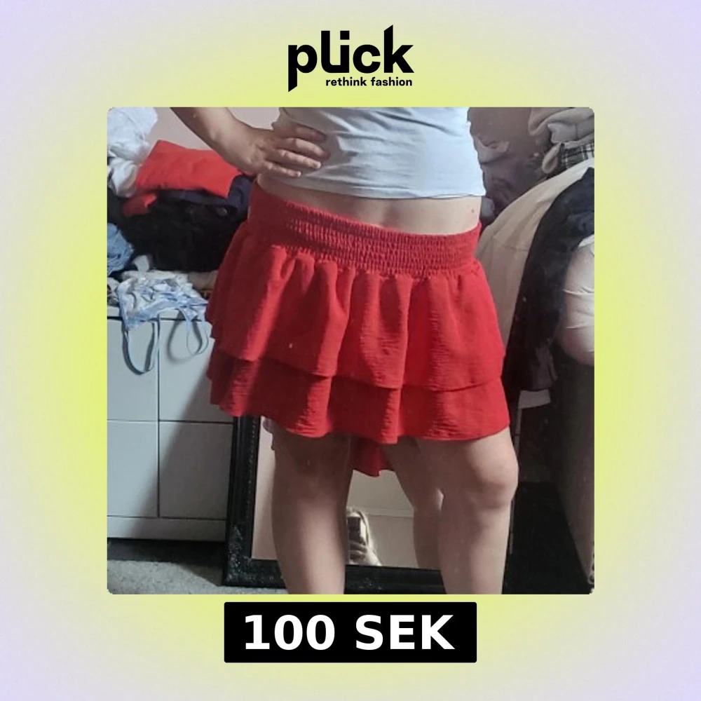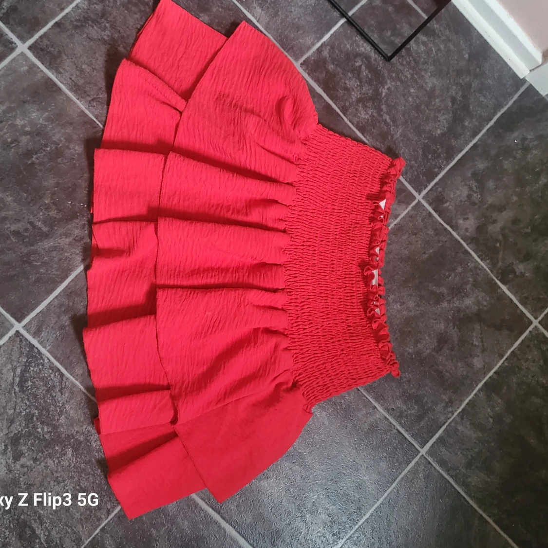 Säljer en kort röd kjol med två volanglager och bred resår i midjan. Kjolen har en luftig och flowy känsla, perfekt för dig som vill ha något färgstarkt och bekvämt. Passar snyggt till både enkla toppar och stickade tröjor.