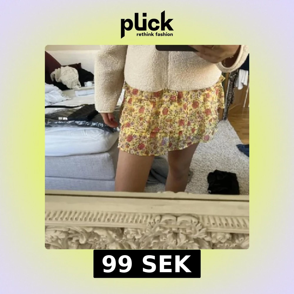 Supersöt kortkjol i gult med blommigt mönster och volangdetaljer. Perfekt för dig som vill ha en lätt och somrig look. Kjolen har en flowy passform och är riktigt skön att bära. Är strl 170 men passar xs/s